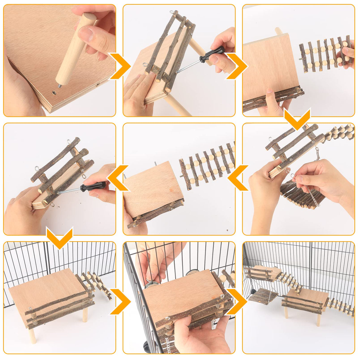 DIY hamster play platform---can be used together or separately How to install? All components are removable and each part is equipped with screws. It can be installed manually, which is very convenient. The ladder can be installed directly against the hole. The fence needs to be drilled by yourself and installed with the screwdriver provided inside. The platform with the swing can be installed at the suitable height according to your needs. In addition, if the swing is not balanced enough, you can adjust the straps to make it more balanced.