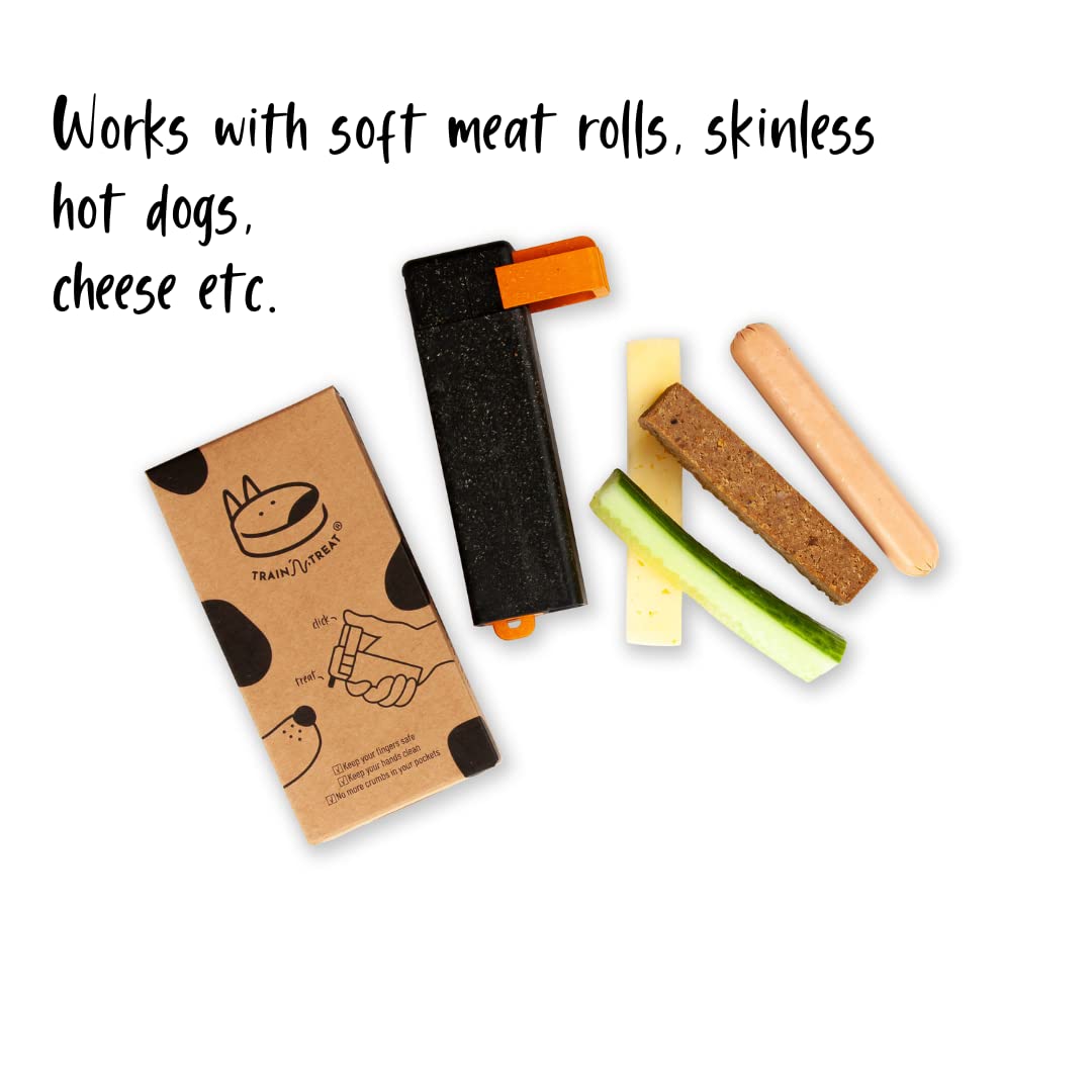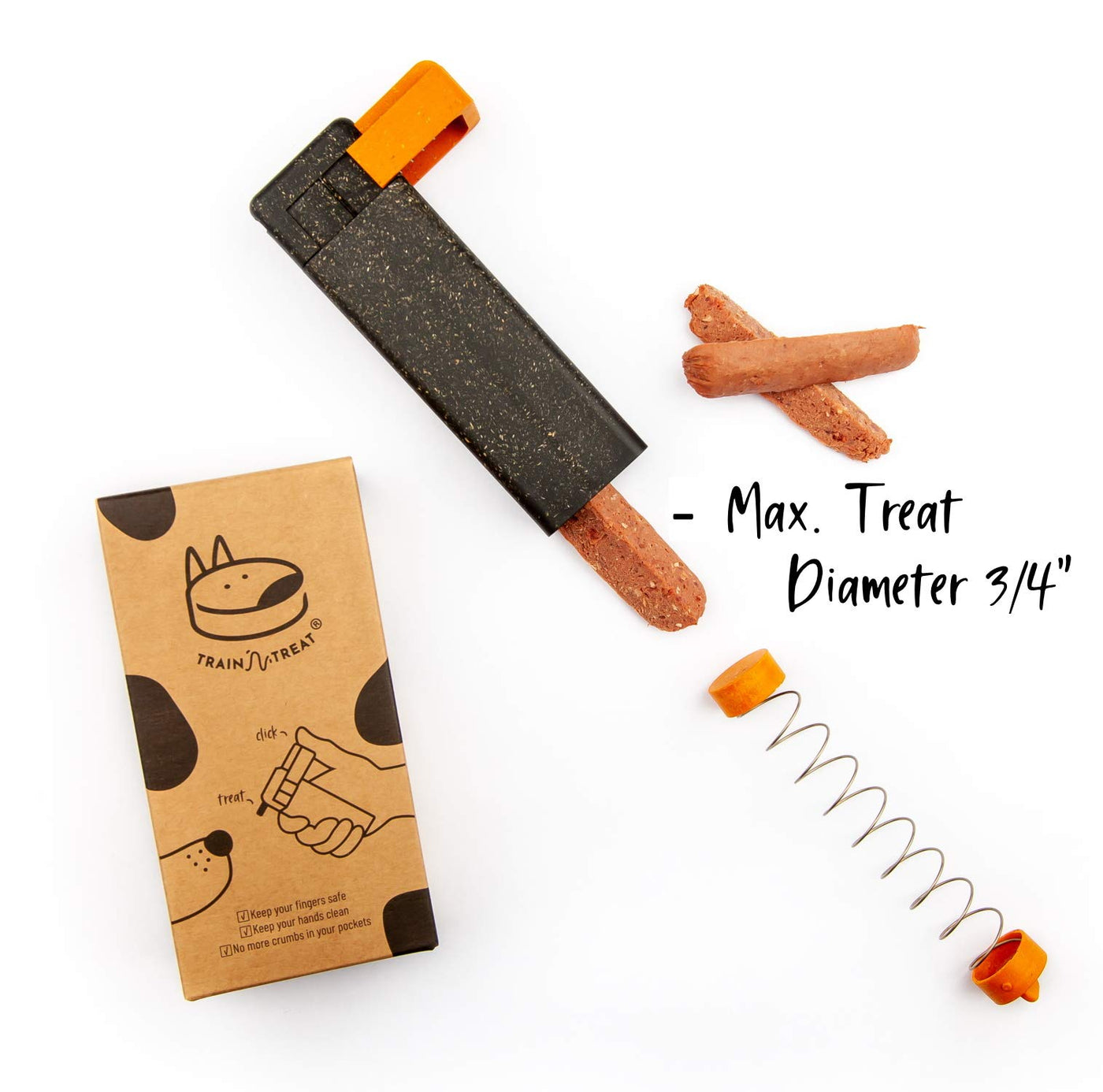 UNIQUE DESIGN AND USABILITY. It is easy to store in your pocket or handbag, making it convenient to carry anywhere you go. You can also attach your favorite wristband or lanyard to it. This handy treat dispenser fits in your pocket and is lightweight to carry. Receiving the treat from your hand strengthens the relationship with your pet. It helps protect your hands from sharp puppy teeth in the early phase of training. Keep your hands, pockets, and handbags free of crumbs. The device is not afraid of water, and you can clean it in your dishwasher. ★ Load it with skinless hotdogs, soft meat rolls, cheese, etc.Please take care not to give your dog too many treats of any kind.From one 4" (10cm) fill, you’ll get 20 treats. ★ You can carry one poop bag inside the Train’N’Treat's handle. Roll the bag and push it inside the handle. Make sure that part of the bag remains partly visible so you can get it out easily. ★ The bio-based material we use is a wood fiber-based composite material. In this material, plastic has been largely replaced with wood fibers. It is as strong and sustainable as wood and has a significantly smaller carbon footprint than plastic. ★ Train’N’Treat is designed to be easily taken anywhere you and your pet go without carrying an extra load on your waist. Your hands, pockets/bags stay clean, and you can use it even with gloves on. ★ Made in Finland. In case of any questions, our Customer Service is here to help you.Please do not hesitate to contact us at info@trainntreat.com.