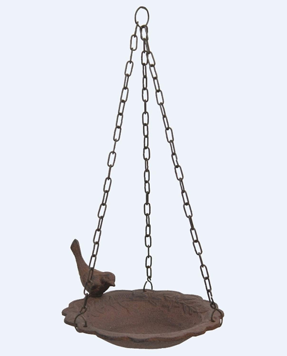 The cute backyard bird design and rust brown cast iron texture of this hanging bird feeder will add style and charm to any garden or yard. Purchase it for your own home or as a nice housewarming gift for any friend or family member.