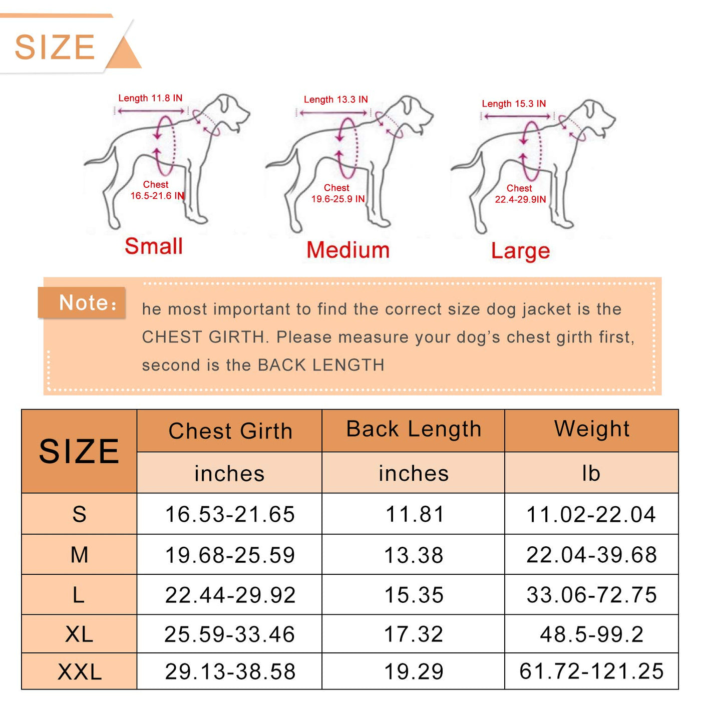 NOTE: If your measurement is between two sizes we recommend the larger size for more comfortable fit about your dog. Please allow sight deviation of measurement data due to different measure methods.