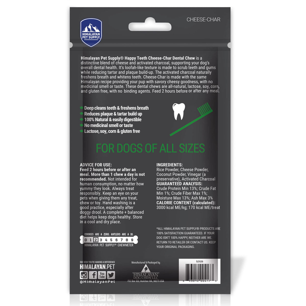 Proudly Made In The Usahimalayan Pet Supply Cheese-Char Dental Chew Is A Distinctive Blend Of Cheese And Activated Charcoal, Supporting Your Dogs Overall Dental Health. This Long-Lasting Chew Provides Your Pup With All The Dental Benefits Your Dog Needs. The Natural Chewing Process Removes Plaque And Tartar Buildup And The Activated Charcoal Adds Extra Cleaning Power, Freshens Breath, And Whitens Teeth. Cheese-Char Is Made With The Same Himalayan Recipe Providing Your Pup With Savory Cheesy Goodness, With No Medicinal Smell Or Taste. These Dental Chews Are All-Natural, Lactose, Grain, Soy, Corn, And Gluten Free, With No Preservatives Or Binding Agents.Feed 2 Hours Before Or After Any Meal. Provides Extra Dental Cleaning Power, Whitens Teeth, And Freshens Breath Reduces Tartar And Plaque Build Up Long-Lasting, 100% Natural, And Easily Digestible No Medicinal Smell Or Taste Lactose, Grain, Soy, Corn, Grain, And Gluten Free