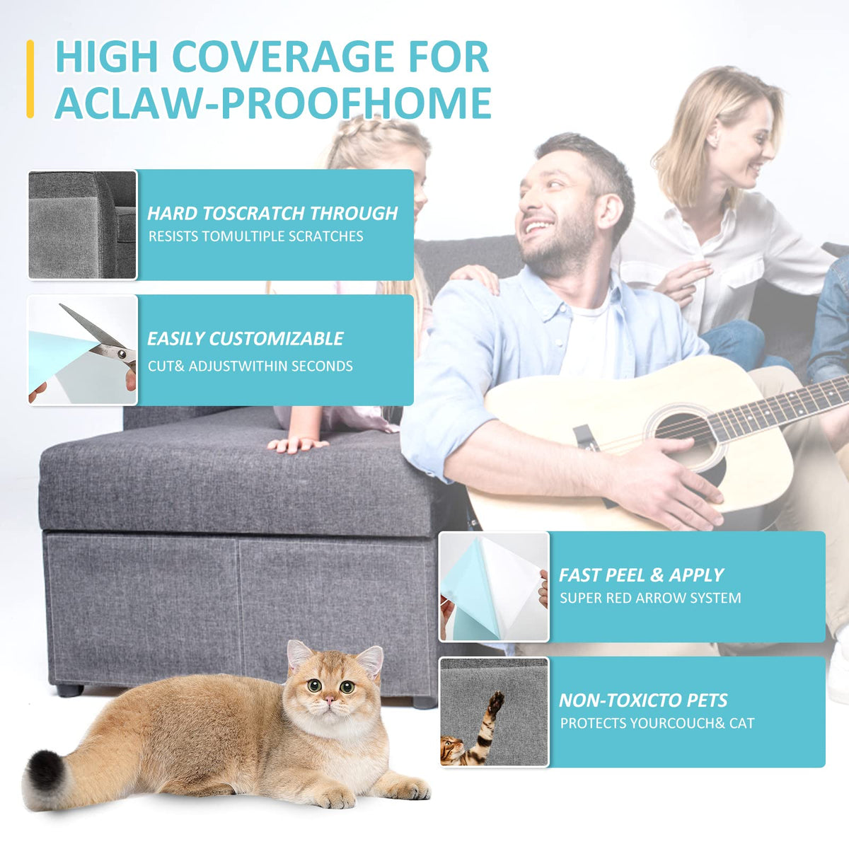 What Is The Material Of The&Nbsp;Happyfreesx Cat Scratch Tape Deterrent? Vinyl Sheet. Why Use Vinyl Sheets Instead Of Other Products? Vinyl Sheets Are Elegant And Hardly Noticeable. Green And Environmentally Friendly,Your Couch Will Look As New.The Sturdy Sheets Will Deter Your Cat From Scratching.The Little Pets Find The Sheets Unattractive.Your Cat Will Stop Scratching Your Furniture Right On The Spot. How To Use? (1) Adjust The Sheet To The Desired Size Or Whole Use.&Nbsp; (2) Peel Away The Backing.&Nbsp; (3) Apply Adhesive Tape To The Place Where Your Cat Likes To Scratch&Nbsp; (4) Peel Away The Backing To Expose The Sticky Front-Facing Tape Side. Reminder: This Product Is Not Suitable For Furniture That Are Chipped, Peeled, Linting Or Fading.