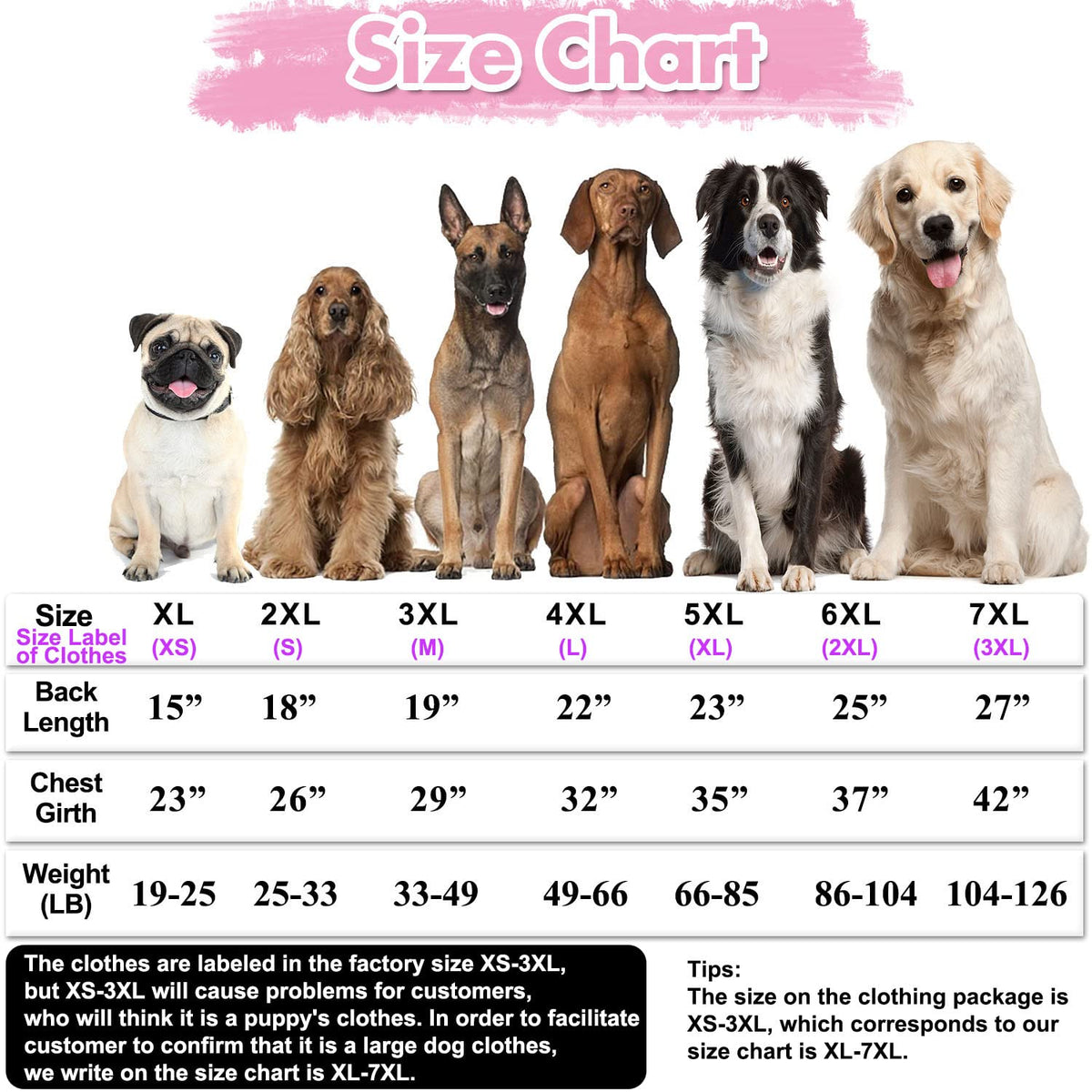 Material: flannel Size: XL-Chest Girth: 23.62in, Back Length: 14.96in, Recommended for dogs weighing 19.84-25.35lb. 2XL-Chest Girth: 26.77in, Back Length: 18.11in, Recommended for dogs weighing 25.35-33.06lb. 3XL-Chest Girth: 29.92in, Back Length: 19.68in, Recommended for dogs weighing 33.06-49.60lb. 4XL-Chest Girth: 32.28in, Back Length: 22.04in, Recommended for dogs weighing 49.60-66.13lb. 5XL-Chest Girth: 35.03in, Back Length: 23.62in, Recommended for dogs weighing 66.13-85.98lb. 6XL-Chest Girth: 37.79in, Back Length: 25.98in, Recommended for dogs weighing 85.98-104.71lb. 7XL-Chest Girth: 42.51in, Back Length: 27.95in, Recommended for dogs weighing 104.71-126.76lb.