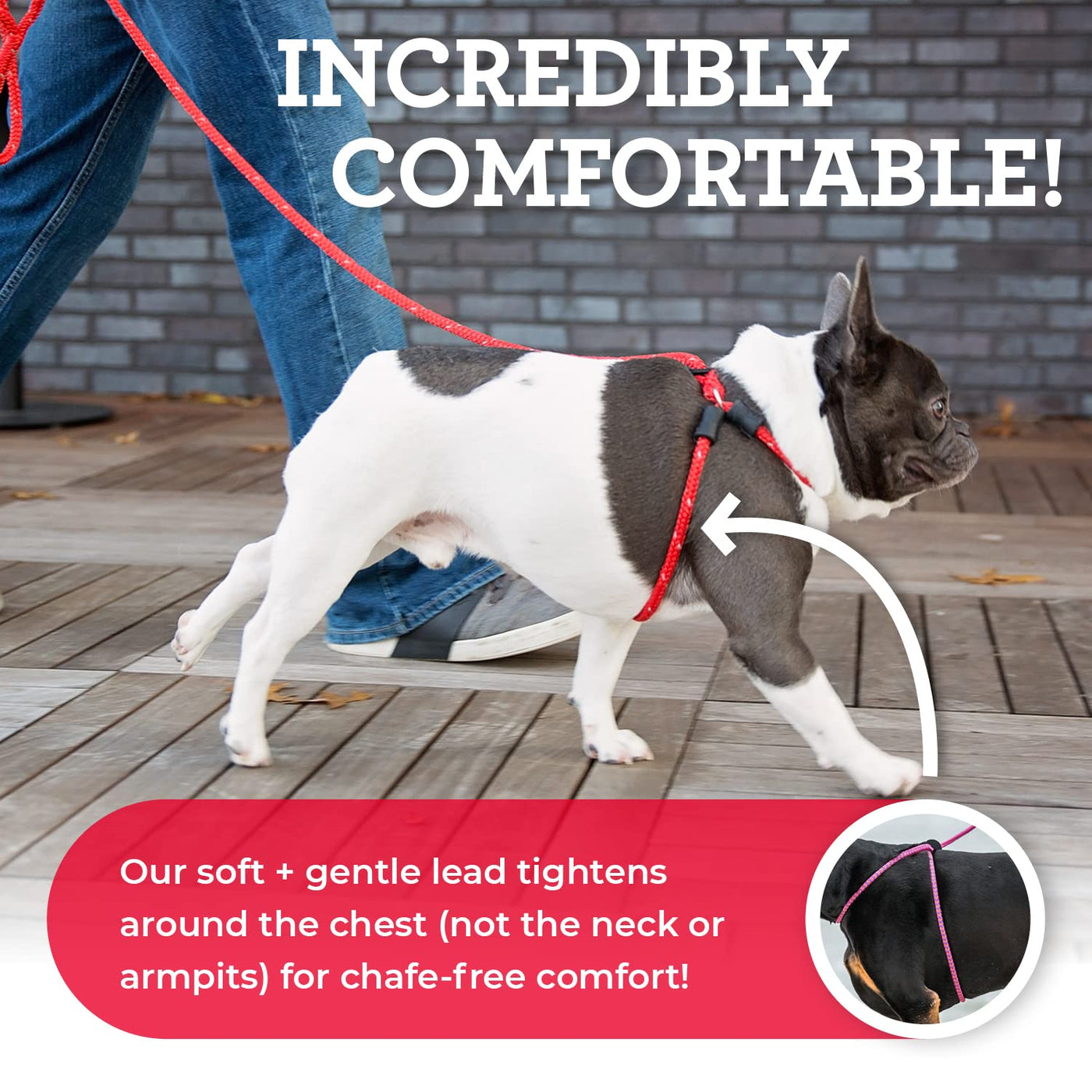 ENJOY CALM WALKS - The Harness Lead dog leash and harness set was designed with ultra comfortable materials to safely prevent your dog from escaping and pulling. Dogs are immediately encouraged to slow their pace by using their own resistance against the leash. Our dog harnesses gently tighten around the chest only not around the neck or armpits.