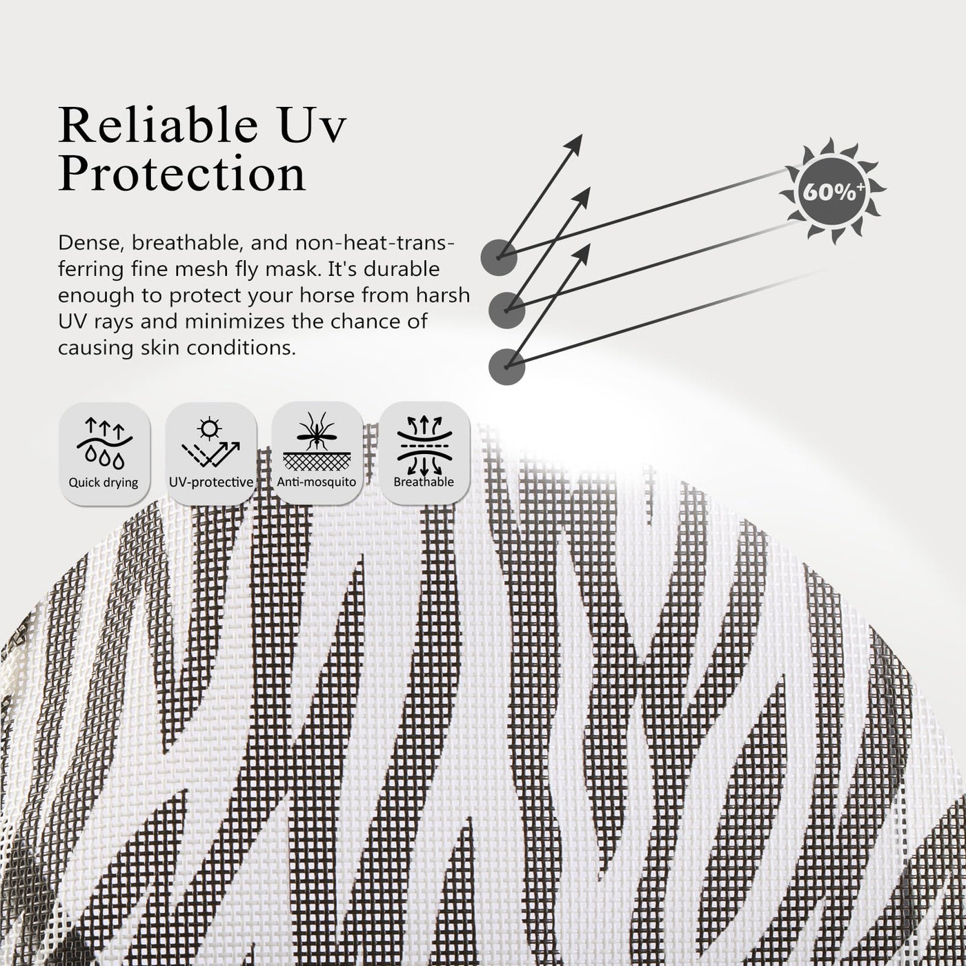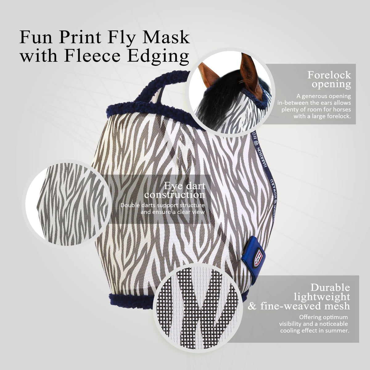 The Harrison Howard All Round Mesh Horse Fly Mask is your horses ultimate summer shield, now available in four delightful prints: Giraffe, Crocodile, Zebra, and Cute Hearts. This mask serves as a protective barrier against the suns damaging UV rays, similar to how a hat safeguards your head. Its especially beneficial for horses prone to sunburn, offering reduced solar glare while keeping dust and debris at bay. Crafted with micro-weave panels around the ears for a snug yet comfortable fit, this durable, lightweight mask provides optimal visibility and a noticeable cooling effect, even on the hottest days. Double darts near the eye area support structure and ensure a clear view. Soft fleece along the edges ensures the mask remains clear of the horses sensitive eyes, minimizing rubbing and abrasion. A thoughtfully designed forelock hole at the top accommodates horses with a large forelock, allowing for a flat and comfortable head placement. Additionally, the robust closure under the jaw meets the demanding conditions of turnout, with a touch tape that adjusts perfectly to your horses size, guaranteeing a snug fit. Harrison Howard All Round Mesh Horse Fly Masks are designed to stay on, offering protection and comfort that horses can see out of easily.