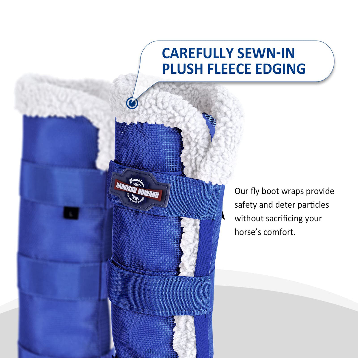 Wearing fly boots should be an important part of the summer routine, whether thats riding, out in the field, at shows, or even in the stable. With the proper fit and the right design that the Harrison Howard CareMaster Fly Wraps with Fleece Lining provide, youll find rubs and lost boots are a thing of the past. Made out of a heavy-duty cool mesh that resists stains and wrinkles, these fly wraps can eliminate sun sensitivity and prevent debris from getting on the lower leg, pastern and cornet areas on your horse. Without such bother on your horses sensitive lower legs, it will also reduce stomping or any other insect-induced stress. Durable and breathable mesh allows for exceptional air circulation and doesnt heat up in the sun, keeping your horse cool and sweat-free. With the carefully sewn-in plush fleece edging, our fly boot wraps provide safety and deter particles without sacrificing your horses comfort. Adjustable hook-and-loop closures provide an adjustable fit, adapting to your horses conformation. Colour option of four: Piano Black, Vibrant