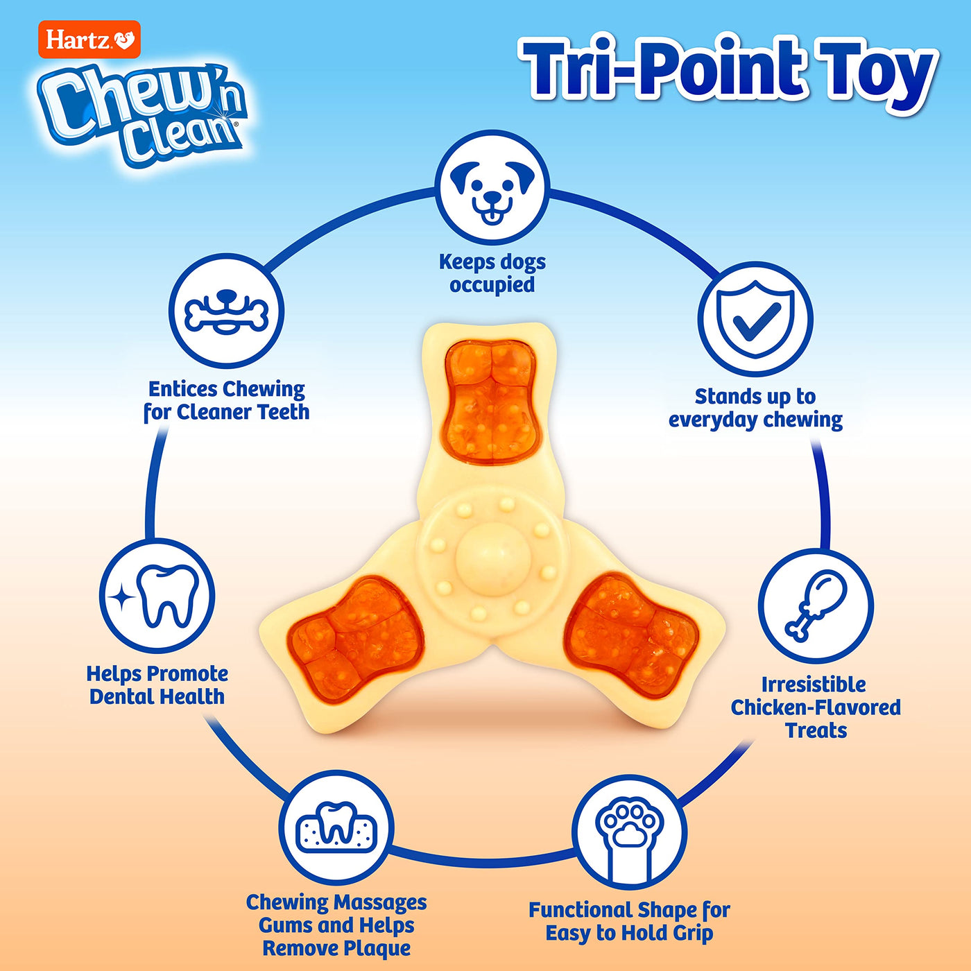 Hartz Chew n Clean Tri-Point dog chew toy and treat in one satisfies your dogs instinctual and innate desire to chew! The durable nylon exterior is embedded with yummy chicken-flavored treats to pique your dogs interest and deliver overall chewing satisfaction for moderate chewers. The tough nylon outer shell has shape contours and nubs to gently massage your dogs gums, remove tartar, and help to keep teeth clean. The best part of this chew toy is the embedded chicken-flavor treats, further motivating your pup to chew, chew, chew! The fun and functional tri-point shape is specifically designed to be easy for dogs to hold with their paws and grasp in their mouth - the easy handling encourages a positive chewing experience. This Tri-Point Chew Toy is available in two sizes: Small for dogs 10 to 20 pounds and Medium for dogs 20 to 50 pounds. Always supervise your pup during play and chew time and select appropriate toys for both your dogs size and chewing habits.