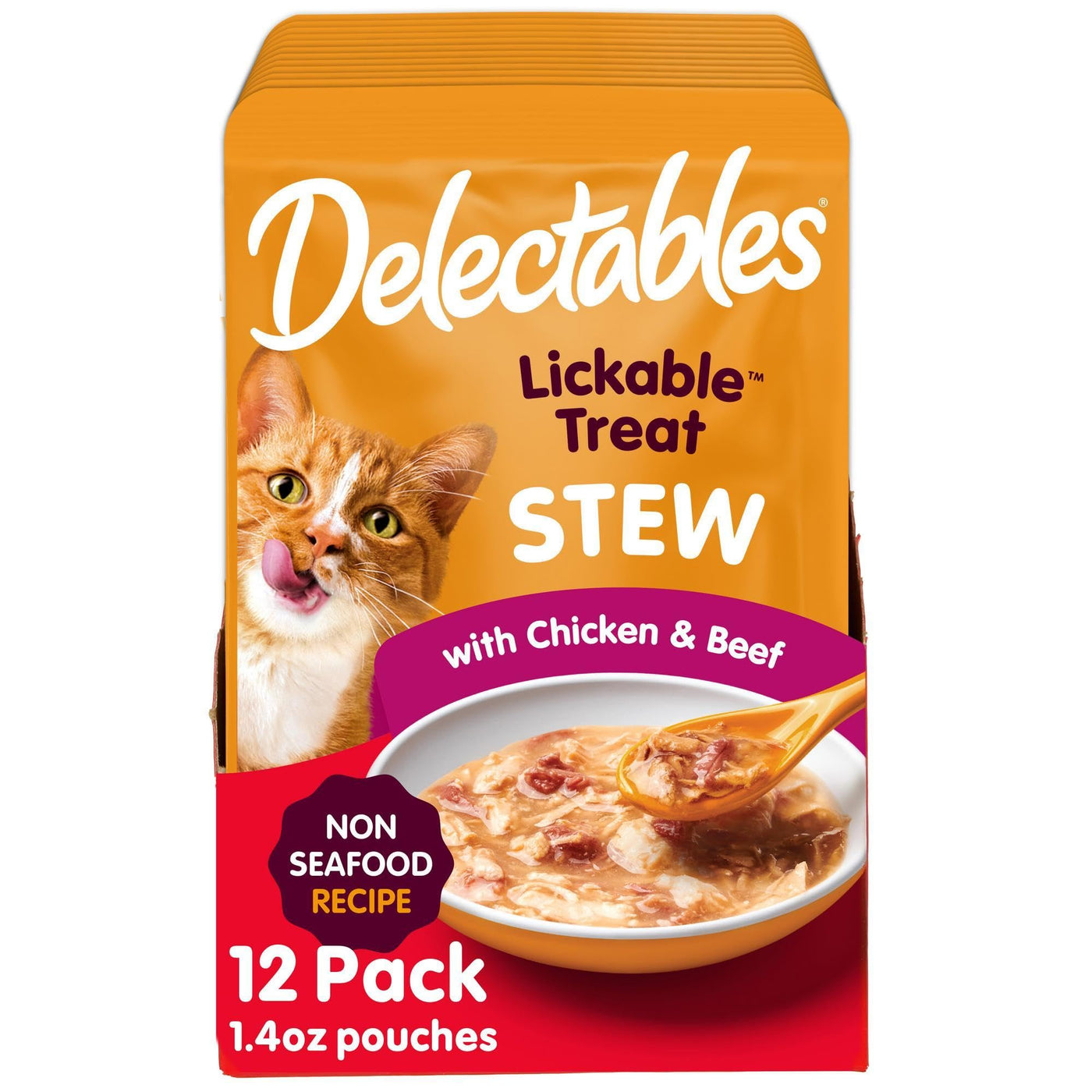 Your favorite lickable cat treats are now available in a Non-Seafood Stew formula! Hartz Delectables unique wet treats combine tender chicken and beef with a hearty sauce, your kitty will be begging for more! This nutritious seafood-free recipe entangles the meat and sauce together so your cat can not only lick up the sauce but enjoy (and gobble up!) the meat too. Even the most finicky eaters enjoy this delectable wet treat - use the single serve pouch as a cat food topper, a quick snack, or a special treat and your cat will love you back! This pack includes 12 - 1.4-ounce pouches of pure kitty satisfaction. Try our Non-Seafood recipe in both Stew & Bisque enjoyable textures in Chicken, Chicken & Veggies, Chicken & Beef, Chicken & Cheese, and Chicken & Duck.