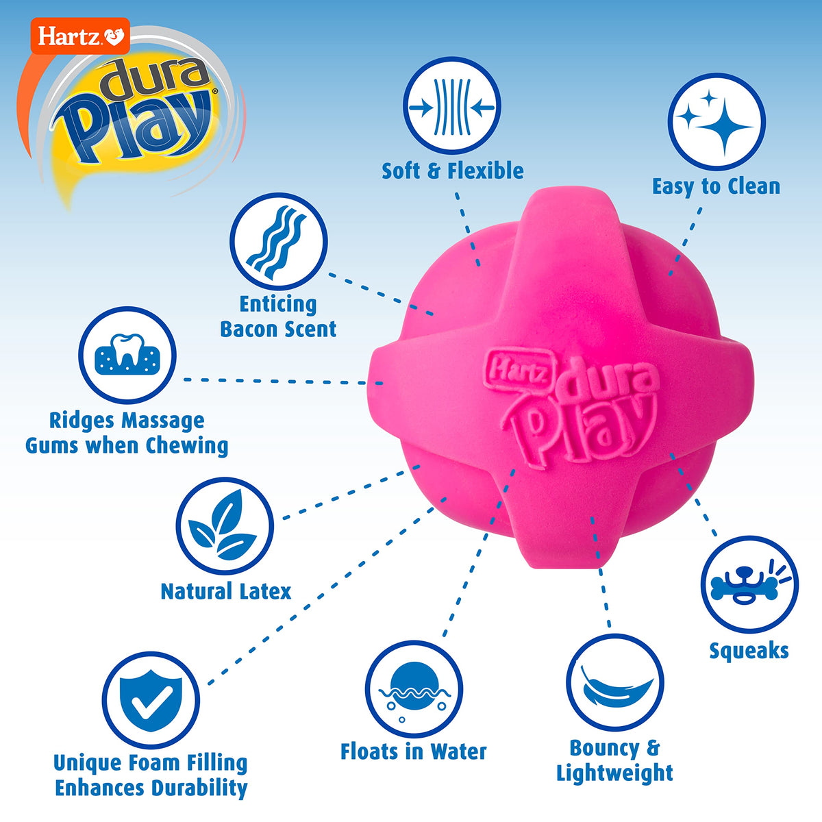 Feel the difference with Dura play natural latex dog toys. Each toy provides long-lasting fun utilizing foam technology that enhances durability, creating an unmatched chew experience with an enticing bacon scent dogs go crazy for. Fun to throw and bounce, Dura play toys even float and are easy to clean. Soft and flexible to the touch, each fun shape is perfect for dogs of all ages. Remember to supervise your pup with any toy.