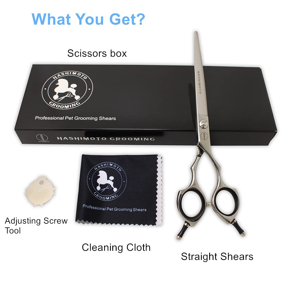 ?Straight Bladethe Straight Scissors Has A Straight Edge And Is Your Best Choice For Overall Trims Of Your Dog Or Cats Coat. It Can Be Used To Cut Long Hair And Fur On Body.?Sharpnessblade Making Of Japanese 440C Stainless Steel; Make Sure The Sharpness,Smooth.?Light Weightslim Body Designed For Dog Groomer,The Light Weight Makes Your Hands Feel More Comfortable During The Grooming.?User Friendlyit Is Sharp And Sturdy, Easy To Handle, Comfortable To Use.?What You Gethashimoto Dog Straight Shears, Scissors Package, Cleaning Cloth, Adjusting Tool,Our Worry-Free 12-Month Warranty And Friendly Customer Service.