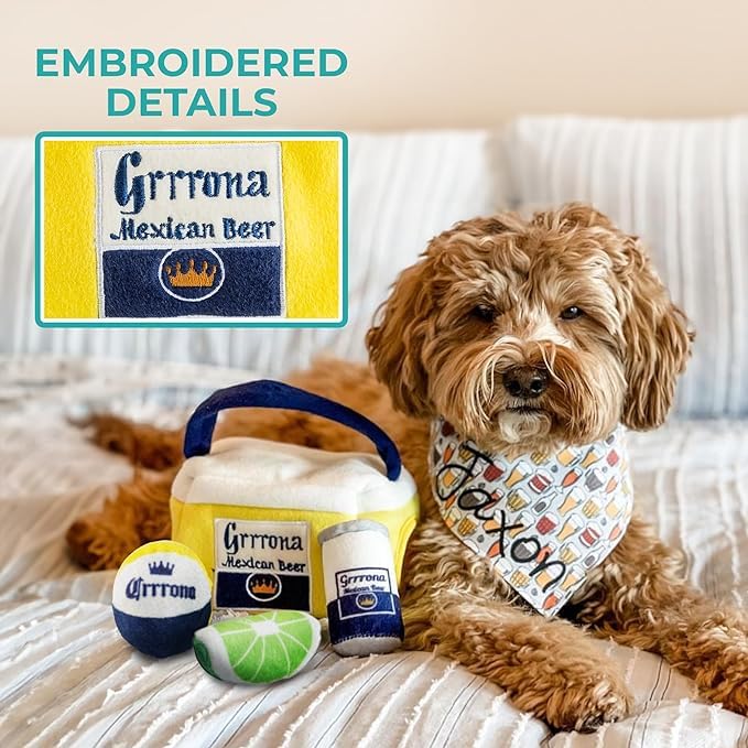 Grrrona Cooler Interactive Toy Introducing Interactive Hide And Seek Toys. Your Dog Will Love Playing With Our New Interactive Grrrona Beach Cooler. Each Grrrona Beach Cooler Plush Toy Includes Three Mini Toys Inside. Grrrona Cooler Includes One Mini Beach Ball, One Mini Beer Can, And One Mini Lime Wedge. All 3 Mini Toys Crackle And Squeak For Hours Of Fun! Let Your Dog Sniff Out The Mini Toys Inside And Try To Figure Out How To Get Them Out. Repeat For Hours Of Fun. Made Of Soft Plush Material. Imported. Grrrona Beach Cooler Measures 5.5'' L X 5'' W X 8'' H Imported
