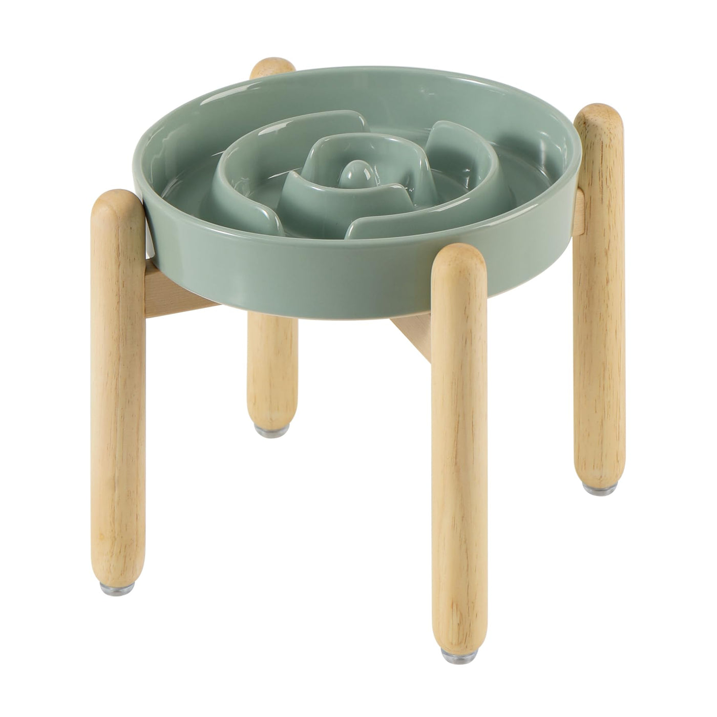 Havniva 7.3Inch Ceramic Raised Slow Feeder Dog Bowl Set, Elevated Wooden Stand For Medium And Small Dog, Puzzle Slow Dish, Preve