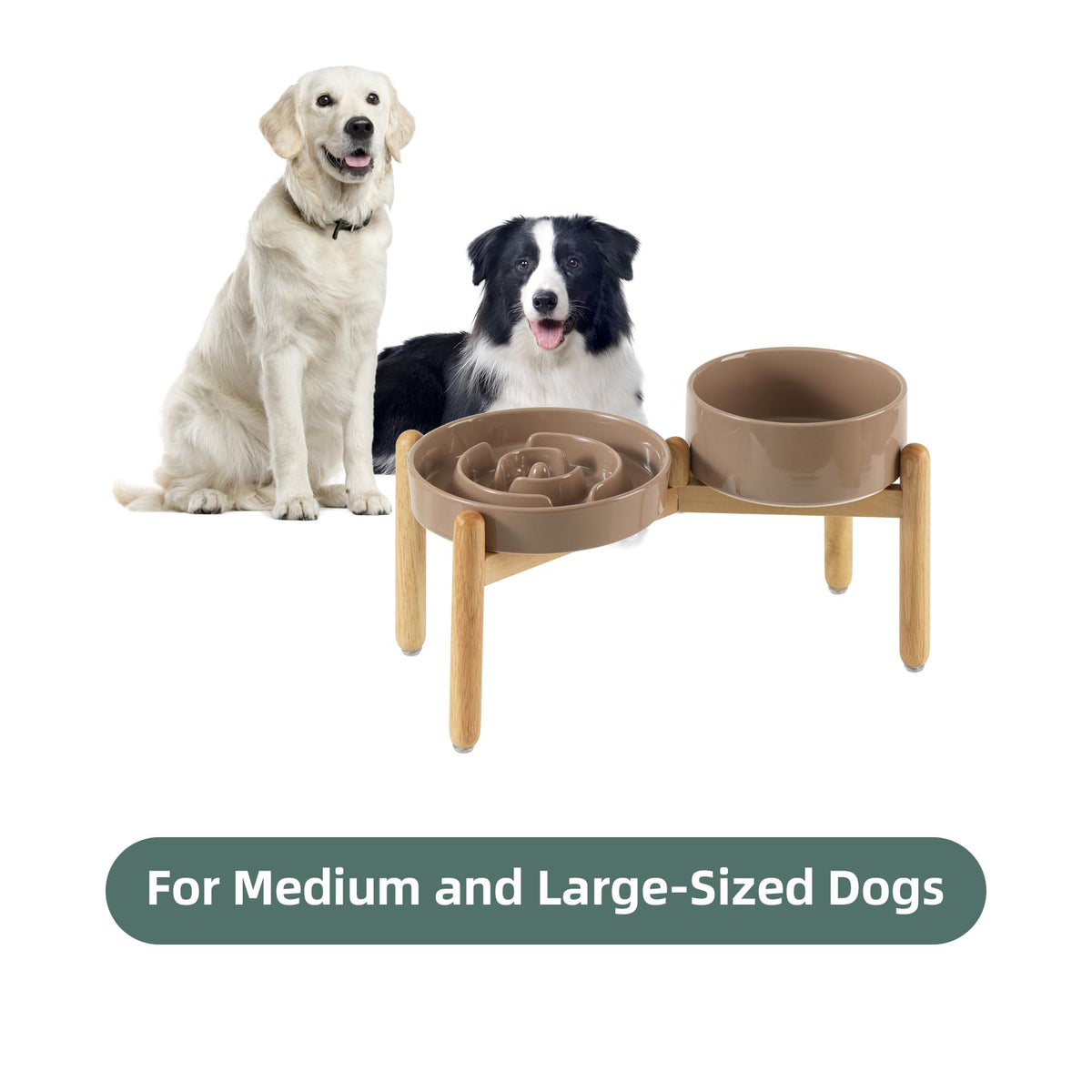 Havniva Ceramic Raised Slow Feeder Dog Bowl Set, Elevated 7.3Inch Bowl And 8.2Inch Puzzle Slow Dish With Wooden Stand For Medium