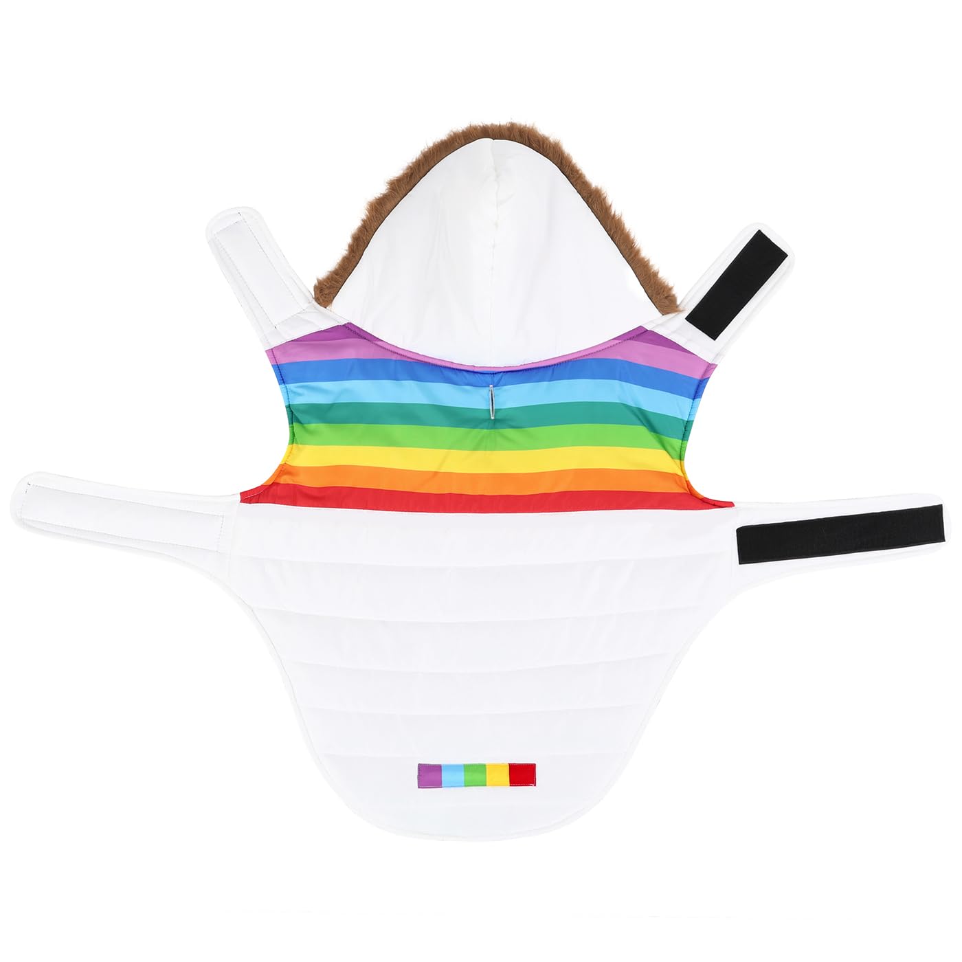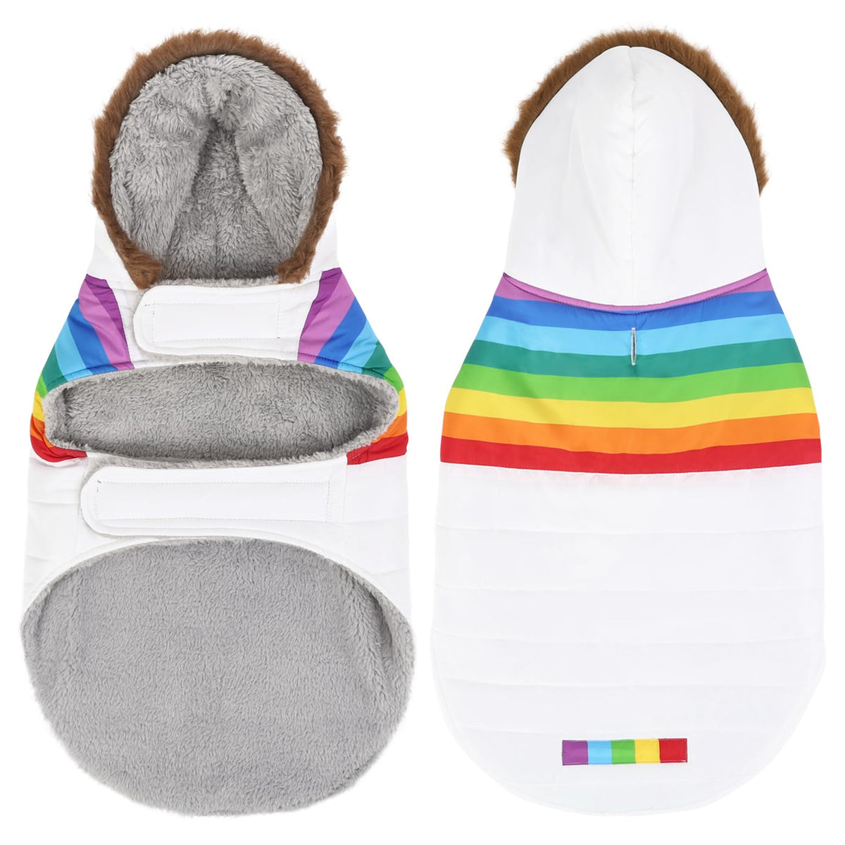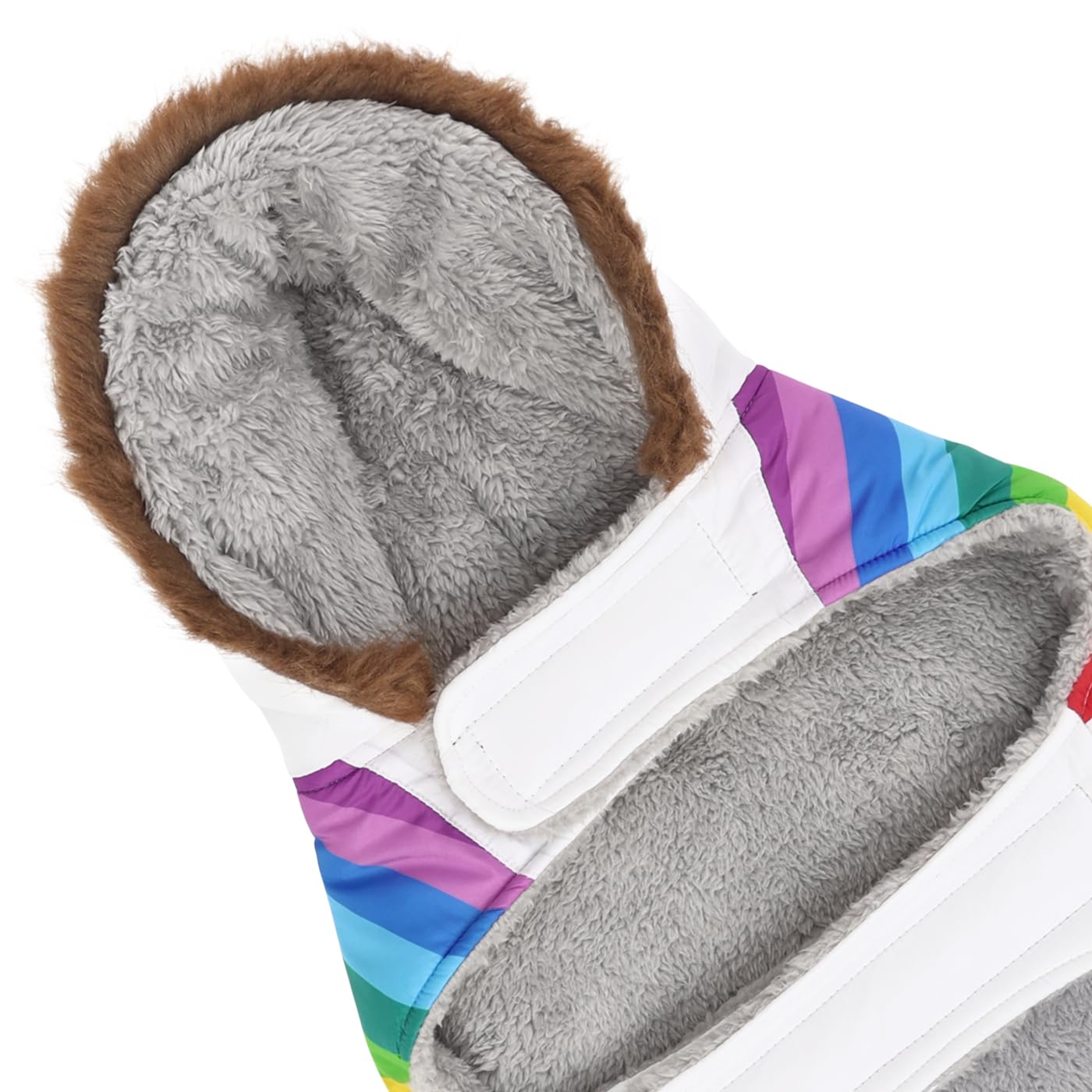 Hde Dog Puffer Jacket Fleece Lined Warm Dog Parka Winter Coat With Harness Hole White Rainbow Stripe - L