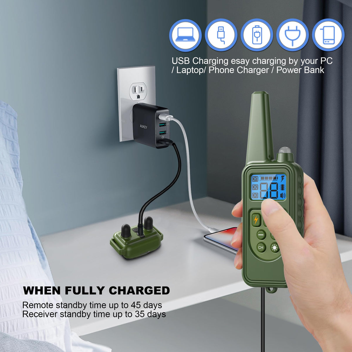 Introduction: The Receive Is Ipx7 Waterproof, It Still Work Even When The Dog Swimming, Raining Or Snowing, Also Can Bathing Freely, The Remote Control Is Not Waterproof. The Control Range Up To 2600Ft, You Can Enjoy The Training Time With Your Dog In Open Space, Such As Backyard, Park Or Anywhere Else Without Restriction. Features: 1. Designed 4 Humane Training Modes: Led Light, Beep, Vibration (1-99 Levels) And Static Shock (1-99 Levels). Led Light Mode Helps You To Locate Your Dogs In The Dark Environment, At Dusk, Thick Foggy Condition. 2. Lcd Screen Can Display All Instructions. 3. Remote Control Distance Of About 2600Ft. 4. Built-In Rechargeable Lithium Battery Saves You The Trouble Of Replacing Batteries Frequently. 5. Material Receiver And Waterproof. 6. Dog Collar With Digital Automatic Code Memory Function, Will Not Be Affected By Similar Products Of Neighbors Interference. 7. The Item Provides 3 Kinds Of Working Modes: Static Shock, Vibration, Beep And Light. Specifications: - Input: 100 - 240V, 50 / 60Hz - Output: 5V, 0.5A - Transmitter Battery Voltage: 3.7V - Receiver Waterproof Level: Ip67 - Battery Type: Lithium-Ion Battery (Built-In) - Transmitter Charging Time: 2.5 Hours - Transmitter Standby Time: 45 Days