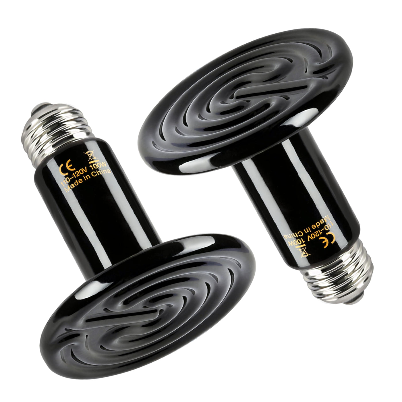 Premium Quality & High Heat Efficiency: Crack prevention and heat bearing with Ni-Cr-Alloy resistance wire inside the high-purity pottery clay bulb; clear thread heating part on bulb head with higher heating efficiency and faster temperature rising. | No Light Emitting: 20,000 hours working hours, not visually light detected by your beloved pets, not disturbing sleep cycle and only giving radiant heat source which creates a natural sunlike heat without light. | 24 Hours Heat Sources: Could be used during day and night nonstop, safe using in porcelain socket, stable heat delivering and energy saving with higher thermal efficiency than normal type heating lamp. | Wide Application: Perfect for using in terrarium of reptile and other amphibian pets to keep temperature in cold seasons; also using in poultry brooder coop, incubating eggs and keep cubs warm. | Specifications: 100W 110-120V 2 pack; for use in standard E26 lamp base; 75mm diameter, 100mm length. Note: High surface temperature, please do not test temperature using your hands; please adjust the spacing between lamp and your pets, too close will case overheating the habitat; keep distance from flammable materials.