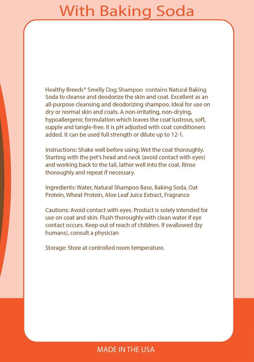 Healthy Breeds Smelly Dog Shampoo contains baking soda, a natural cleanser and deodorizer, and aloe vera, which is known to soothe irritated skin. Excellent as an all-purpose cleansing and deodorizing shampoo. Ideal for use on dry or normal skin and coats. A non-irritation, non drying, hypoallergenic formulation which leaves the coat lustrous, soft, supple and tangle free. It is pH adjusted with added coat conditioners. It can be used at full strength or you can dilute it up to 12-1.