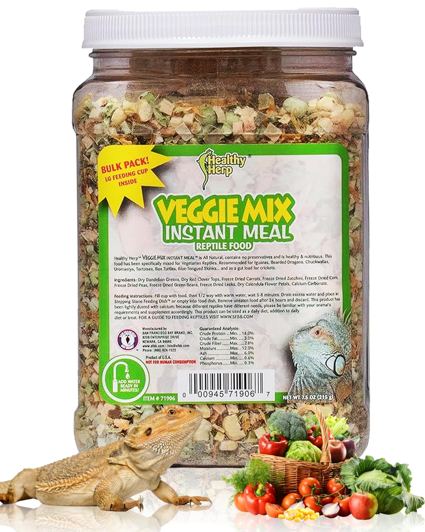 Q: How does the Healthy Herp Veggie Mix come packaged?A: It comes in a bulk pack with a large feeding cup included. This feature ensures easy and mess-free serving for your reptiles.
