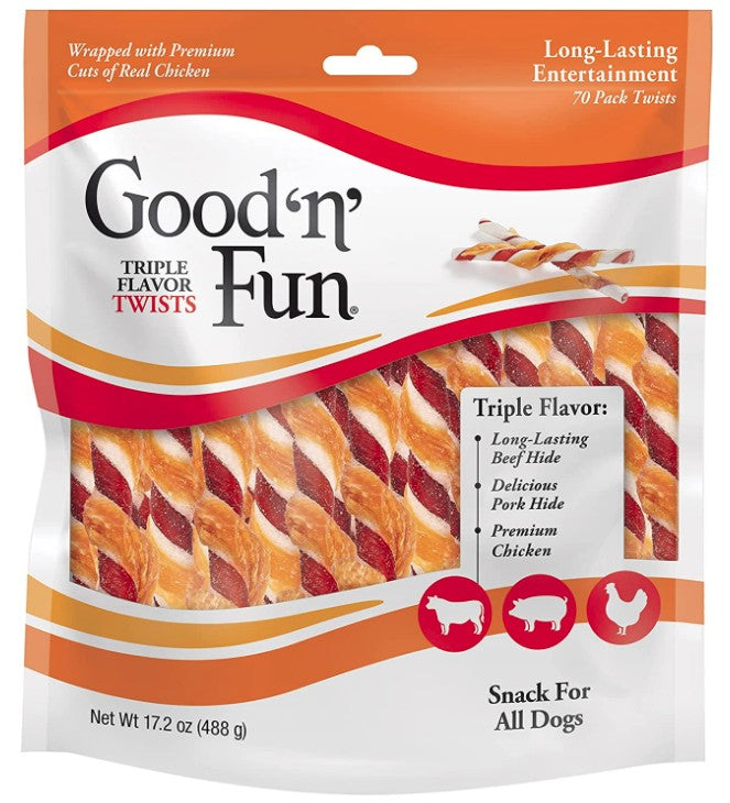 Good n Fun brand offers a tasty smorgasbord of flavors that dogs love. These delicious chews are made from the finest ingredients, including real beef hide and real chicken, to create truly delightful, long-lasting treats your dog will love. Tails will be wagging for these flavor-packed Good n Fun Triple Flavor Twists. These twist-shaped dog treats are made with a savory combination of three flavors that dogs love most. These delicious chew treats are made from the finest pork and beef hides, then wrapped with real chicken to create a truly delightful, long-lasting rawhide treat your dog will love. High in protein, Good n Fun Triple Flavor Chews are a healthy and delicious way to satisfy your dogs natural urge to chew. The natural action of chewing also helps reduce tartar buildup and remove plaque. These gourmet, twist-shaped chews make for long-lasting entertainment. Give your dog up to one Good n Fun Triple Flavor Twist per day. For supervised consumption only. Select a chew slightly larger than your pets mouth. Discard chunks or fragments. Always provide plenty of fresh drinking water and visit your veterinarian regularly.THREE FLAVORS DOGS LOVE: Made from pork and beef hides, then wrapped with real chicken.LONG-LASTING: Good n Fun Triple Flavor Chews are truly delightful, long-lasting beef hide treats your dog will love.HIGH IN PROTEIN: Perfect to give your dog every day for a chew full of fun and flavor.NATURAL CHEWING ACTION: Promotes clean teeth from the natural action of chewing.TWIST SHAPE: Wrapped with premium chicken for a taste canines crave.
