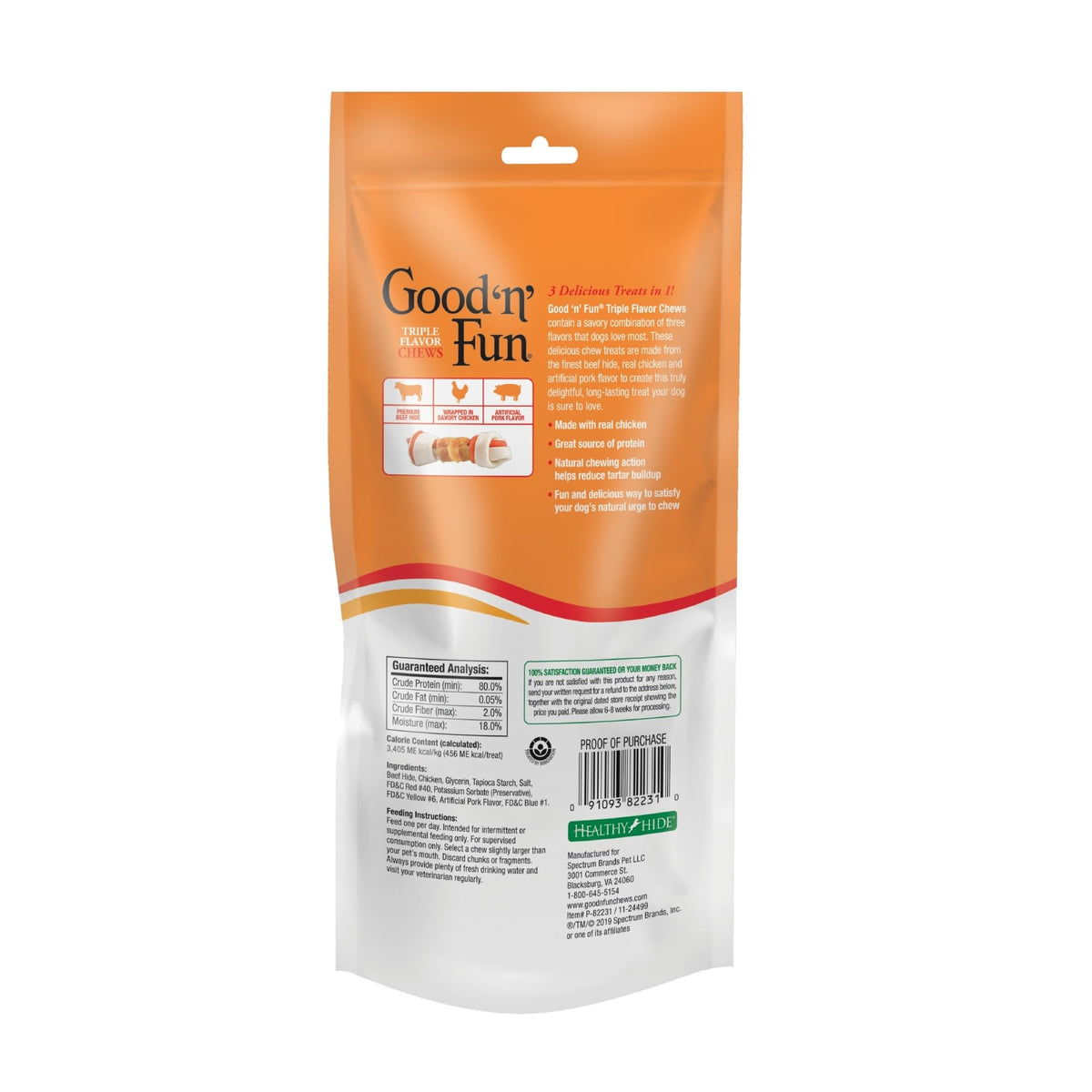 Healthy Hide Good n Fun Large Triple-Flavor Chews are crafted with natural rawhide and wrapped in a variety of real meats for a delectable flavor no dog can resist! These gourmet dog chews help reduce tartar buildup and promote better dental hygiene while satisfying your dogs urge to chew.Natural rawhide bones wrapped in real meatReduces tartar buildup and promotes better dental hygieneMade with open-pasture, grass-fed beefhideSatisfy your dogs urge to chew8 boneThese long-lasting rawhide dog chews provide hours of entertainment. The beefhide used in these chews comes from grass-fed, free-range cattle raised in the open pastures of Ecuador. Recommended for outdoor use.Feeding Guide: Give as a treat or reward once a day, using a chew slightly larger than your dogs mouth. Discard any chunks or fragments and always provide plenty of fresh, clean water. Wash your hands after handling treats.Ingredients: Rawhide, Pork Hide, Chicken, Water, Glycerin, Salt.Guaranteed Analysis:Crude Protein (min) - 80.0%Crude Fat (min) - 0.05%Crude Fiber (max) - 1.0%Moisture (max) - 14.0%