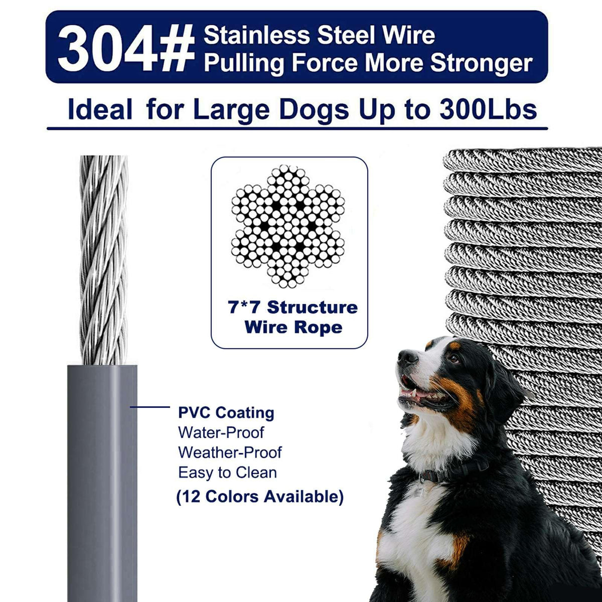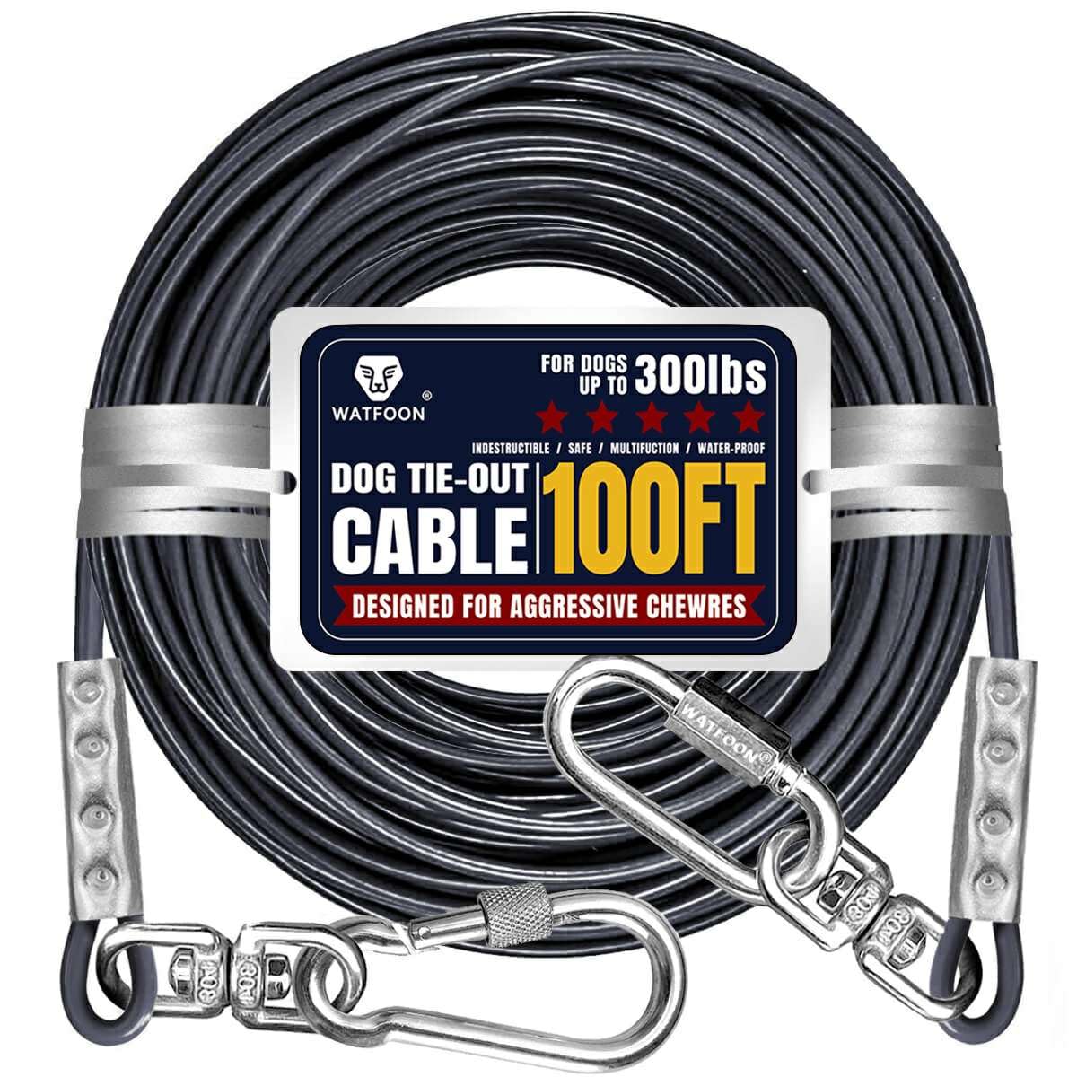 Xtra Long Stainless Steel Cable --- Our dogs tie out leash/long cable 100 feet for dogs made of stainless steel wire 5mm in diameter with PVC coating high tensile strength impact toughness corrosion resistance Double crimp for stronger ends this dog runner large cable has break strength of 1000 pounds. WATFOON tie-out cable provide more space for freely movement while ensuring your pets safety