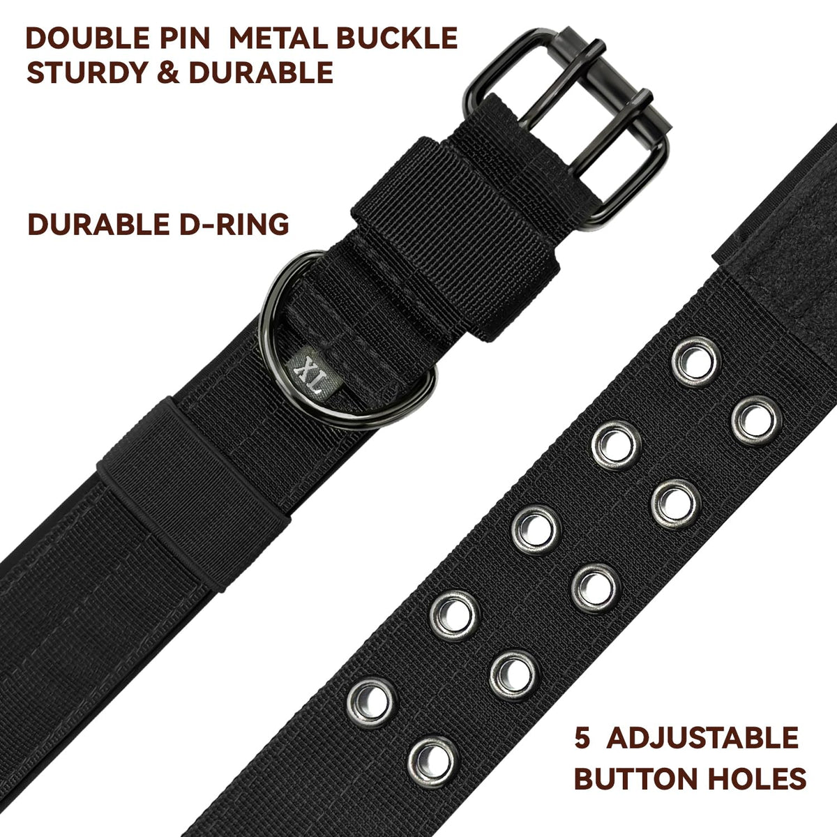 High Quality Material, Comfortable to Wear : The heavy duty dog collar is made of double-thick nylon material and lined with padding, which makes it comfortable and non-allergenic for your dog to wear. Adjustable: The dog collars for medium dogs are made of heavy duty metal D-ring and double pin metal buckle with 5 adjustable points.The length can be freely adjusted according to different needs. Magic Sticker Panel Design: The tactical dog collar is designed with magic sticker panels for ID tags, training patches, badges or other accessories with hook and loop fasteners. SIZE: Thick dog collar come in 3 different sizes for you to choose from. Medium (33-43CM/13''-17'');Large (43-53.34CM/17''-21'');X-Large (45.72-55.88 CM/18''-22'').Dog collar with metal buckle are all with a width of 1.5''. Multi-Occasion, Multi-Variety: Large dog collar can effectively control your dog while training, patrolling, hiking, jogging, hunting, camping, working, running, jumping, traveling, camping. Suitable for German Shepherds, Border Collies, Rottweilers, Great Danes, Doberman Pinschers, Golden Retrievers, Huskies, Labradors, Alaskan Sled Dogs, and many other medium and large dogs.