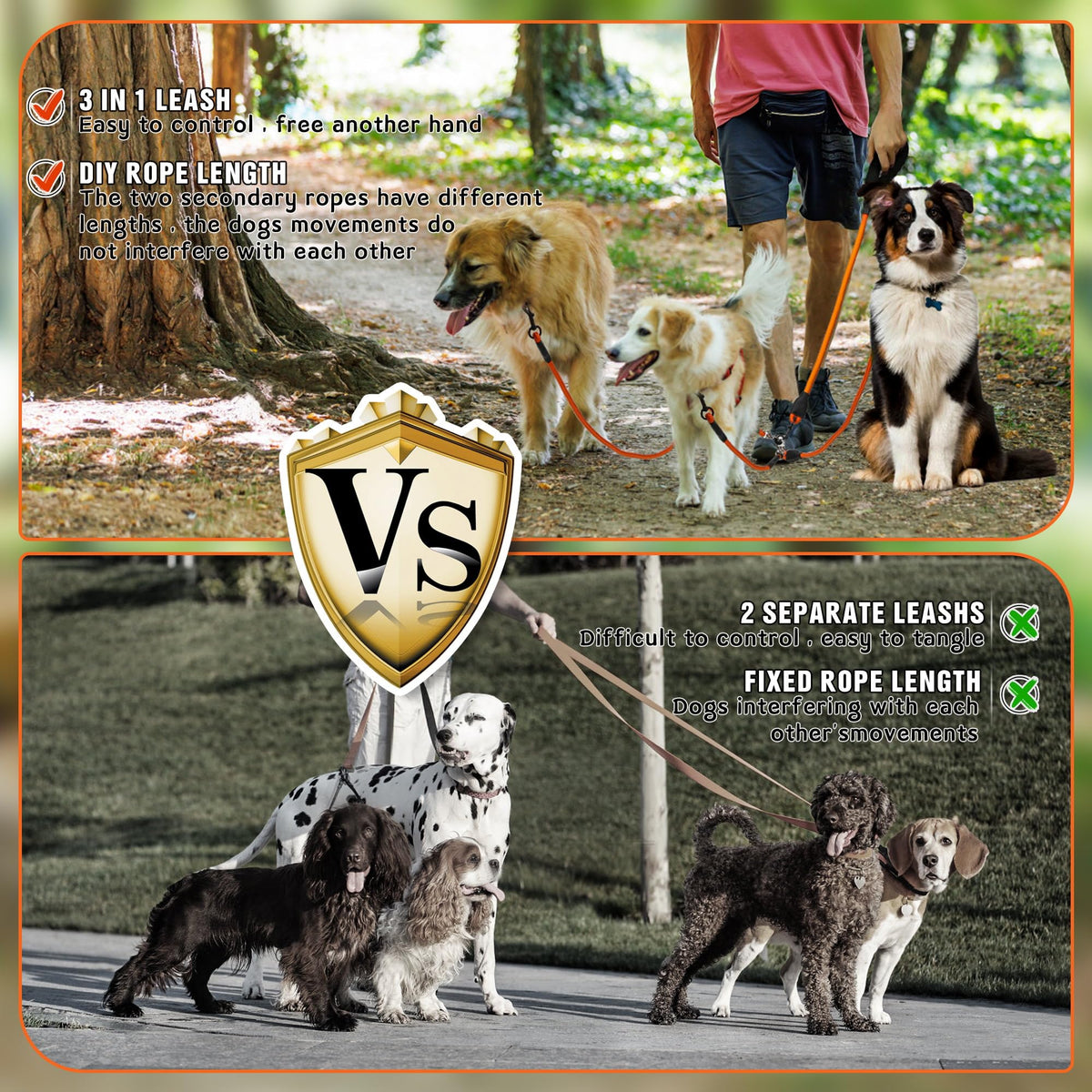 Mengbei Tribe The Multifunctional 3 In 1 Dog Traction Rope Makes Walking For One Or Two Dogs Or Three Dogs More Convenient And Easy.Tangle Free, Comfortable Handle, Durable Metrial, Lets Enjoy The Happy Time With Your Dogs! Chew Resistant,No Harm: Prevent Your Pets From Eating Rope Fragment.Thickening Soft Pad Handle: Added Comfort By Absorbing The Tension And Protecting Your Hands. This Double Dog Leash Suitable For Small To Large Dogs Such As Poodle,Golden Retriever, Dachshund ,Huntaway ,German Shepherd, Samoyed, Husky,Shih Tzu, Pitbull, Terrier, Eskimo Dog, Dalmatian Dog, Teddy ,Samoyed. You Can Go Wherever With Your Dog.