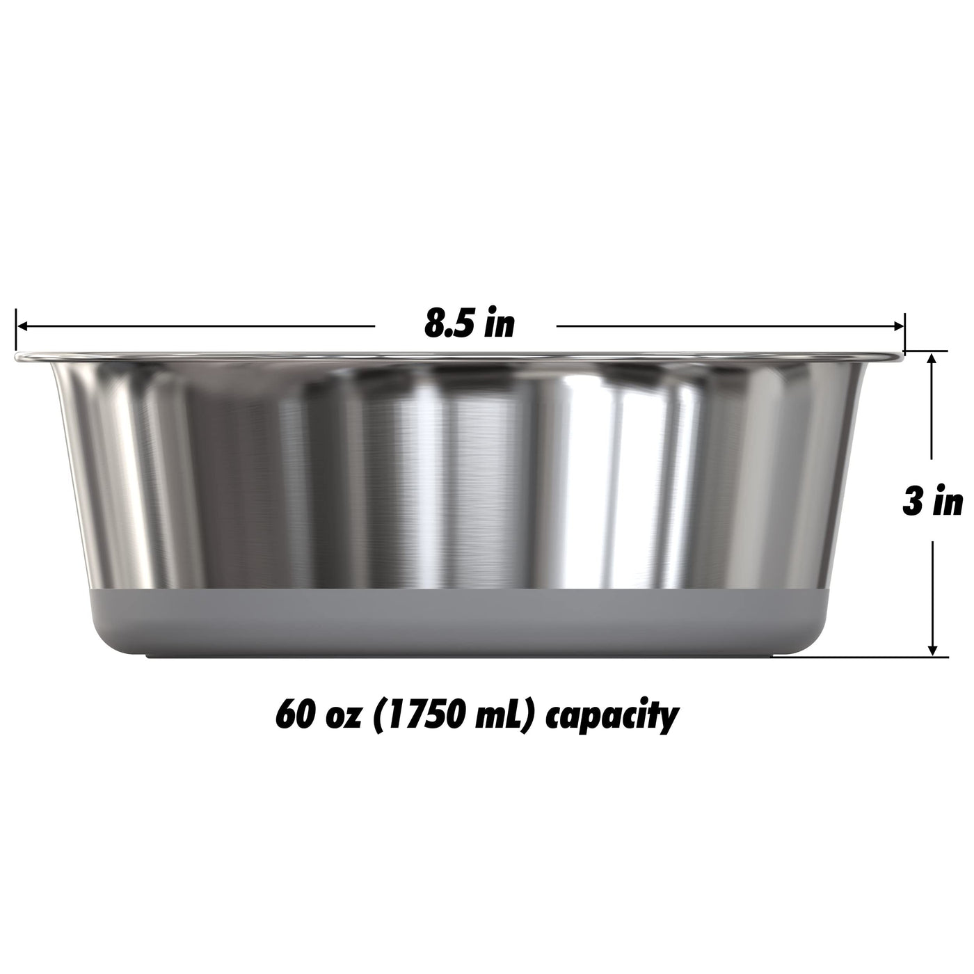 Over 2.5 Lbs! The Original Heavybowl Is A Weighted Bowl Helps Prevent Enthusiastic Dogs And Cats From Pushing Or Tipping Their Bowl While Eating Or Drinking It Starts With A Deep Bowl Made From Sturdy Stainless Steel Polished To A Mirror Finish. A 3/8 Inch Thick Steel Plate Is Precision Welded To The Base Of The Bowl For Added Weight. Finally, The Entire Base Is Covered With Non-Slip Soft Silicone Rubber That Is Fully Bonded To The Bowl. Dishwasher Safe. The Polished Stainless Steel Finish Is Easy To Clean And Safe For Your Pet. 8.5 Inch (21.5 Cm) Diameter. 3 Inch (7.5 Cm) Height. 60 Fl Oz (1750 Ml) Capacity. 2.5 Lbs (1.2 Kg) Total Weight.