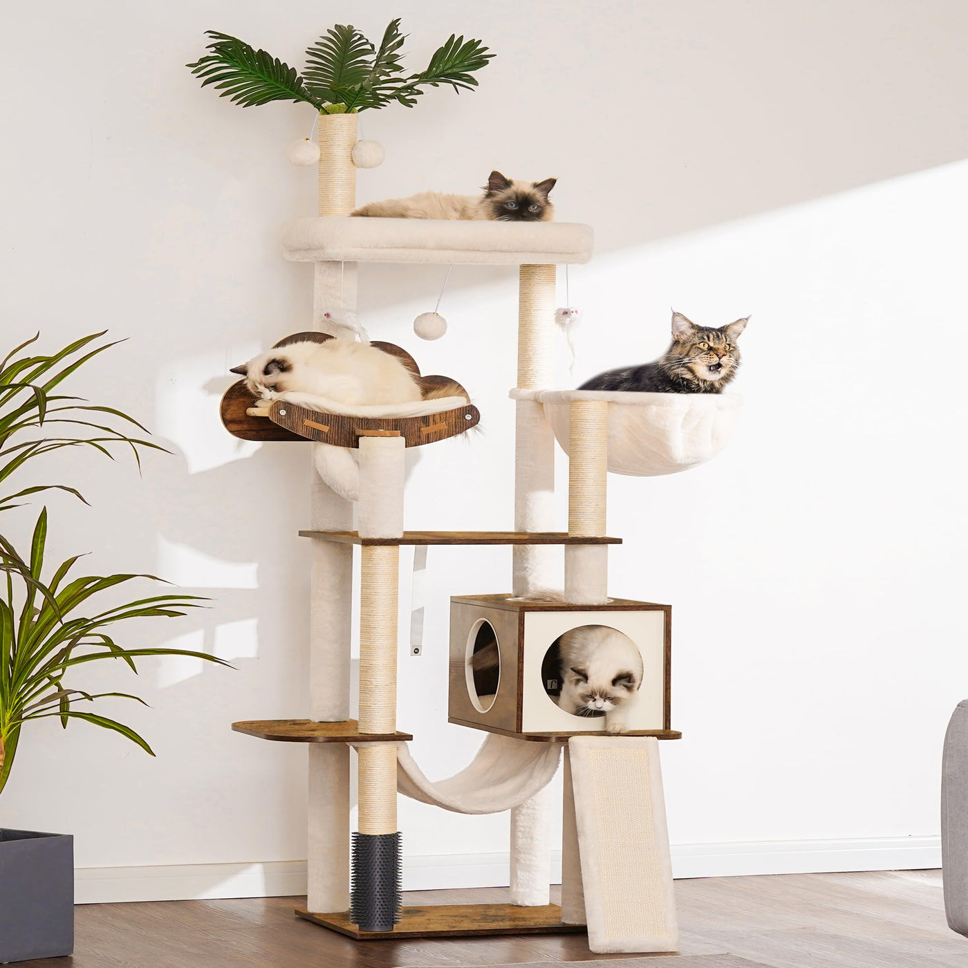 Hebly Wood Cat Tree For Indoor Cats, Cat Condo For Large Cats With Self Groomer,Modern Cat Scratching Tower With Basket,Hammock,