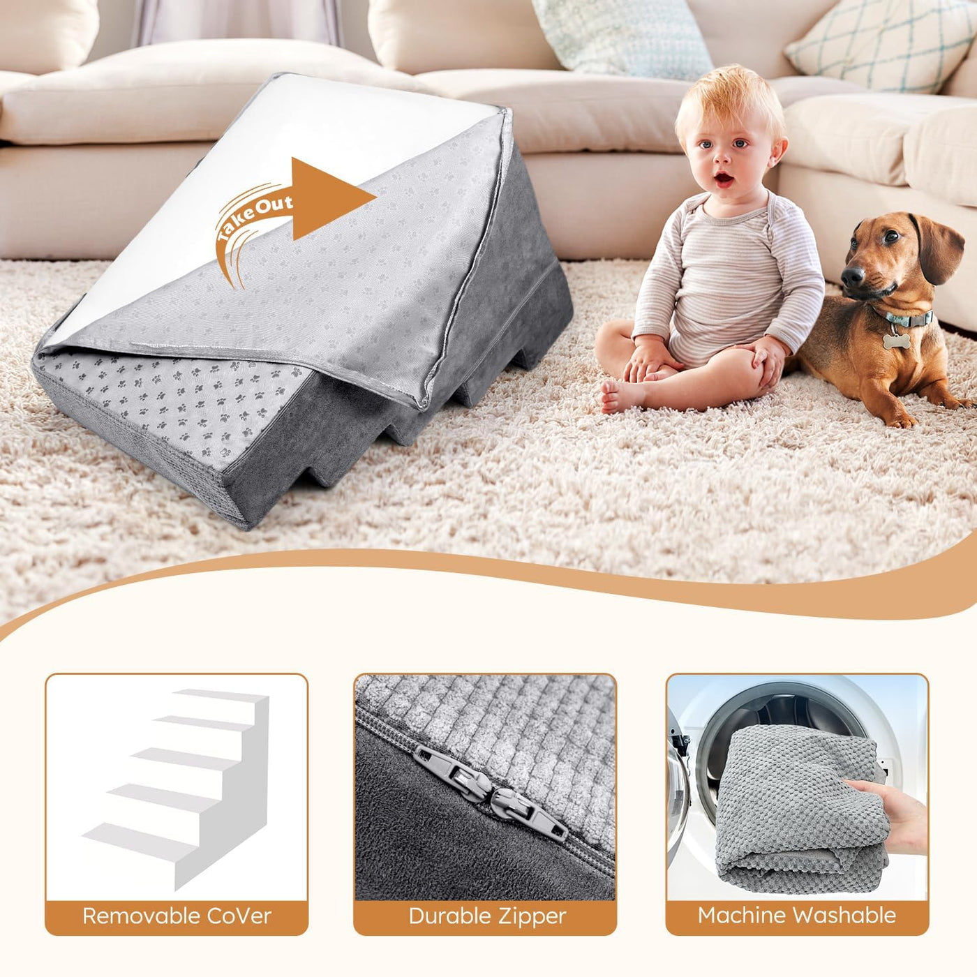 Heeyoo Dog Stairs Is Made Of 30D High Density Foam And Firm Supporting Board Which Is Sturdy Enough. The Dog Step Is Covered With Non-Slip Corduroy For Extra Stability. It Comes In 3, 4, And 5-Step Options. The 3-Step Is 13.5'' To Help Small Pets Get On Low Sofas (Up To 18Inch High). The 4-Step Measures 18'' For Reaching Beds Or Sofas (Up To 23Inch High). The 5-Step Which Is 22.5'' Suits For Higher Beds (Up To 27Inch High).This Pet Step Bottom Fitted With Rubber Dots Which Provides Extra Grip On The Floor To Prevent Slipping, Ensuring That The Steps Will Not Shift While Your Pet Climbs Up And Down. The Dog Ramp Has A Detachable Washable Cover Which Can Be Cleaned By Hand Or In The Washing Machine. After Removing The Foam From The Compression Bag, Please Wait 24-48 Hours For The Foam To Fully Expand Before Use. If You Have Any Questions About Our Dog ,