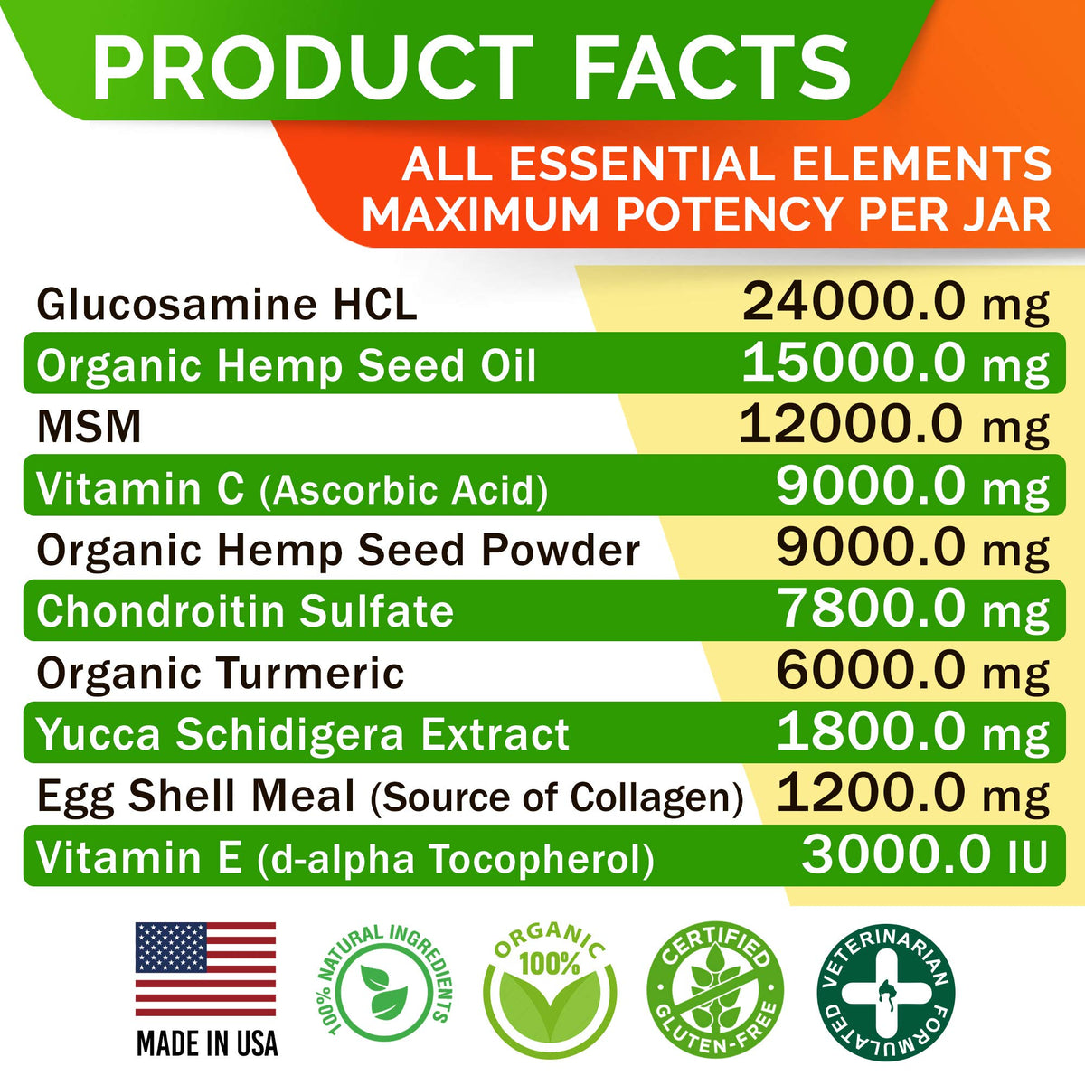 We get it, seeing your furry friend in discomfort is tough. Thats why we crafted our Hemp Treats + Glucosamine for Dogs with care and love. Remember, consistency is key to seeing results - every pup is unique! But hey, if you dont notice a difference or need help, our 24/7 customer service team is here for you! Were committed to your pets well-being and proud of our USA-made quality. Why choose Hemp Glucosamine for Dogs? Natural Pain Relief: Specially beneficial for senior pets or larger breeds, offering a gentle way to ease discomfort. Tasty Treats: Your dog will love these delicious chews, making it easy to support their joint health daily. Quality Ingredients: Packed with glucosamine, chondroitin, MSM, and turmeric, known for reducing inflammation and supporting joint health. Gentle Yet Effective: Ideal for easing discomfort, particularly for our aging friends or those larger in size, providing a natural, gentle approach to pain relief. Perfect For: Specially tailored for senior dogs who deserve a little extra care and large breeds that benefit from joint support. Every breed under the sun-tiny terriers, majestic mastiffs, and everyone in between. Furry family members who prefer a tasty treat over pill-swallowing. In a nutshell, our Hemp Treats + Glucosamine for Dogs offer a fun, tasty way to keep your pup bouncing happily. Theyre not just treats; theyre little health boosters packed in a yummy chew! Give them a try and watch your best friend thrive.