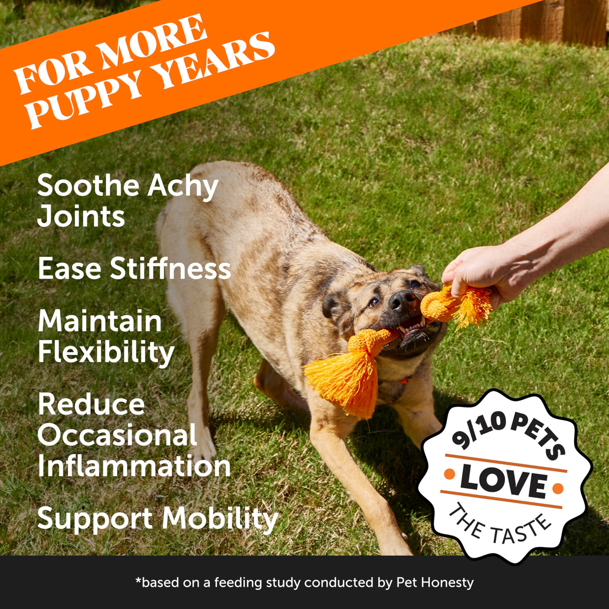 Hemp Mobility Hip & Joint Supplement Snacks Pet Honestys Hemp Mobility Chews are an effective and delicious way to keep your pet healthy, active and pain-free. These supplement snacks are packed with the best known natural ingredients that deliver an antioxidant, anti-inflammatory effect to relieve stiff joints and increase overall activity in dogs. Organic Turmeric - A powerful natural anti-inflammatory that helps relieve stiff joints and aid in digestion Glucosamine HCL - An known, effective joint support supplement that is 30% more concentrated than Glucosamine Sulfate Organic Hemp - One of the most nutritional oils available, hemp is filled with Omegas and helps reduce pain and inflammation in joints Green Lipped Mussel - Shown to be critical for building bones and cartilage and known as a superfood because of its rich source of vitamins, Omega-3 fats and other nutrients Use Chart: *Each treat is 4 grams Dog Weight: 25 lbs or less 1 Snack 26-75 lbs. 2 Snacks 75 lbs or more 3 Snacks Caution: For pet consumption only. Not to be consumed by humans. Do not exceed the recommended dosage. Store in a cool dry place.