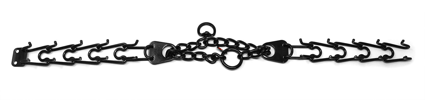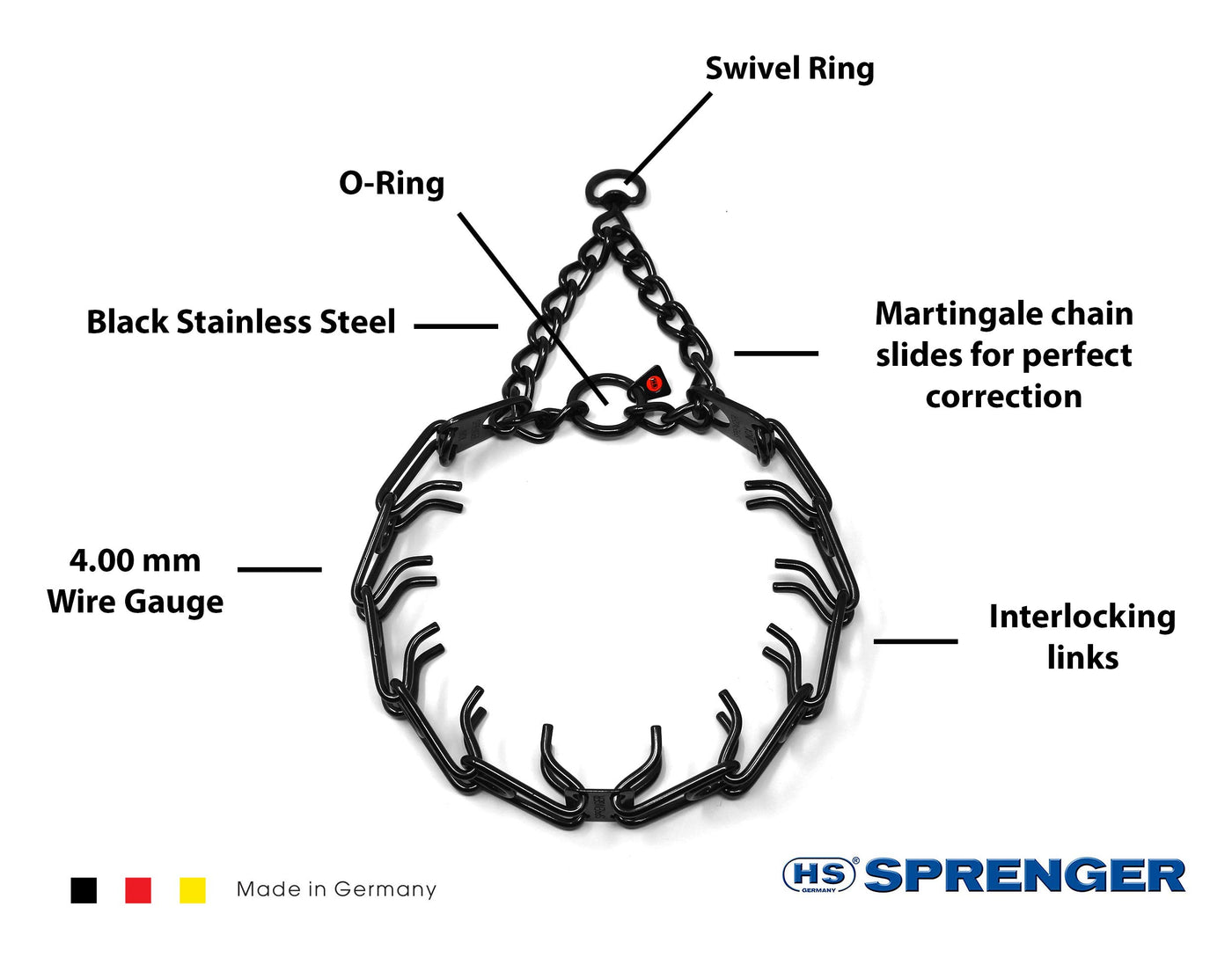 The Herm Sprenger Black Stainless Steel Prong collar is one of the most recognizable and popular names in obedience training tools. A safe and effective alternative to choker collars, it puts even pressure around the neck, about every half inch, pinching the skin in a band. This collar does not apply direct pressure to the trachea, so you can train your dog with little or no tugging, jerking, or pulling. The addition of a center plate connector allows the middle link to be configured symmetrically, enabling the prongs to tighten in the same direction. Made of high quality German Black stainless steel, the size of this collar can be adjusted by adding or removing the links individually. Features: interlocking links, each link equipped with two blunt prongs slips over dog's head for easy on, easy off slightly beveled prong tips easy to increase or decrease in size Made of high quality Black stainless steel Additional links sold separately. Sizing instructions: collar should fit snuggly just below the dog's ears, measure the circumference of dog's neck and add 2'. These Black Stainless steel collars with Swivel come in three sizes 2.25mm gauge x 16 in overall length, 3.2mm gauge x 23 in overall length and 4mm gauge by 25 in overall length