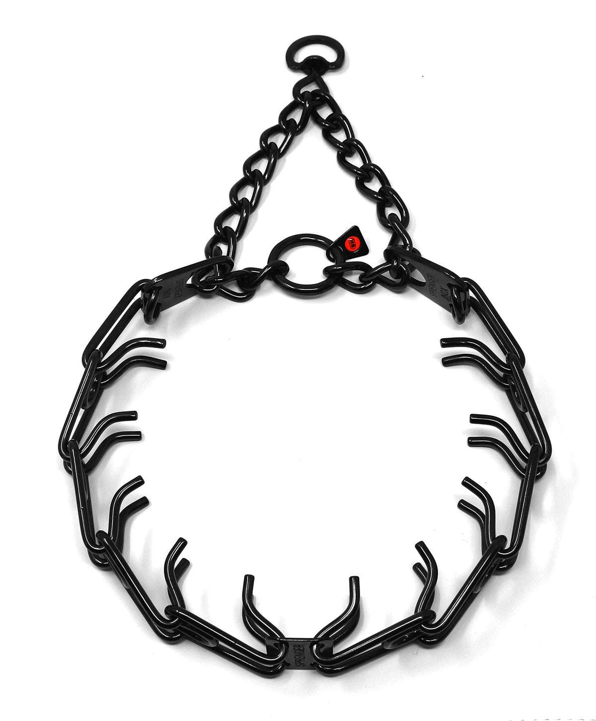 Q: Are there any special features of the Herm Sprenger Black Stainless Steel Prong Collar?A: Yes, this collar features interlocking links with two blunt prongs on each link, making it effective for training without applying direct pressure to the trachea. It also includes removable links, allowing you to adjust the size easily.