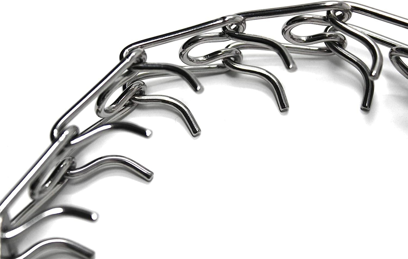 The Herm Sprenger Stainless Steel Training collar is one of the most recognizable and popular names in obedience training tools. A safe and effective alternative to choker collars, it puts even pressure around the neck, about every half inch, pinching the skin in a band. This collar does not apply direct pressure to the trachea, so you can train your dog with little or no tugging, jerking, or pulling. The addition of a center plate connector allows the middle link to be configured symmetrically, enabling the links to tighten in the same direction. Made of high quality German stainless steel, the size of this collar can be adjusted by adding or removing the links individually. Features: interlocking links, each link equipped with two blunt links slips over dog's head for easy on, easy off slightly beveled tips easy to increase or decrease in size Made of high quality stainless steel Additional links sold separately. Sizing instructions: collar should fit snuggly just below the dog's ears, measure the circumference of dog's neck and add 2'.
