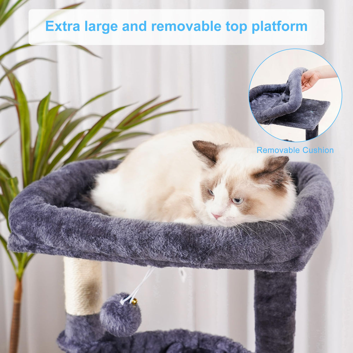 Structure designed for cats: Structure of the cat tree is designed according the climbing habits of cats Both old cats and kittens can easily climb up and down on it Taking a comfortable rest on the cat tower: Kittens can lean on the well-padded top platforms for a rest or observe the surroundings sleep in cat cave protecting them from the disturb from outside Two hammocks cats favorite: A cozy basket-shaped hammock gives kitties a feeling of been wrapped up like sleeping in a soft cloud There are two on this cat house One of the hammock is fixed both ends gives more security for cat lying in it Multiple places for cats to sharpen claws: A wide scratching board and sisal-wrapped scratching posts are just what cats need A plush ball add more fine for cat to play Sturdy and stable: The cat furniture is supported by sturdy posts Strengthened baseboard can avoid wobbling and ensure overall stability Anti-toppling fittings ensure double safety