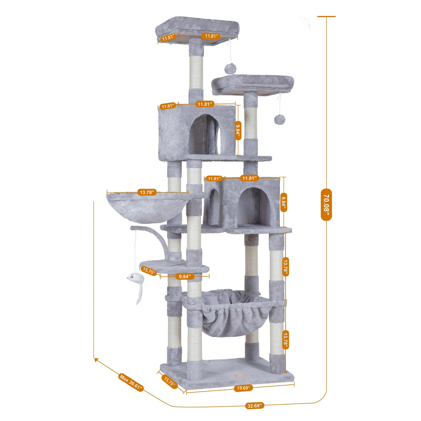 Heybly Cat Tree Specifications::Color: Smoky Gray/Light/Beigeoverall Dimensions: 21.65' L X 17.72' W X 70.08' H (55&Nbsp;L X 45&Nbsp;W X 180&Nbsp;H Cm)Scratching Post Thickness: 2.56' (6.5 Cm)Overall Product Weight: 37.47&Nbsp;Lbs (17&Nbsp;Kg)Package Weight: 40.77&Nbsp;Lbs (18.5&Nbsp;Kg)Assembly Required: Yes. All Hardware And Instructions Provided Materials:Frame Structure: Carb P2 Particle Boardexterior Cover: Faux Fur Fabric; Natural Sisal Rope