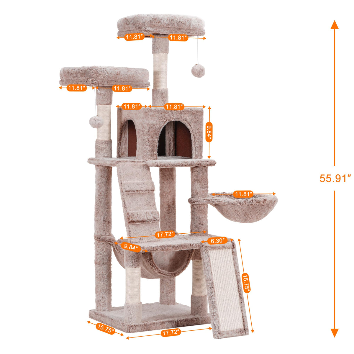 Q: What are the overall dimensions of the Heybly Cat Tree?A: The Heybly Cat Tree measures 15.75 inches in length, 17.72 inches in width, and 55.91 inches in height (45 L x 40 W x 142 H cm), making it suitable for various indoor spaces.