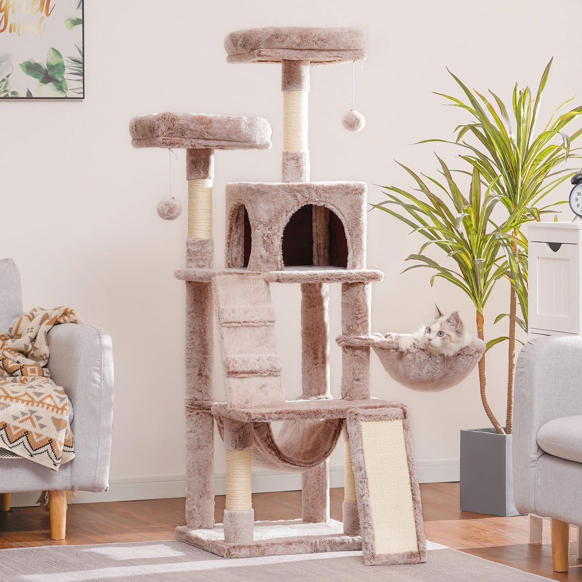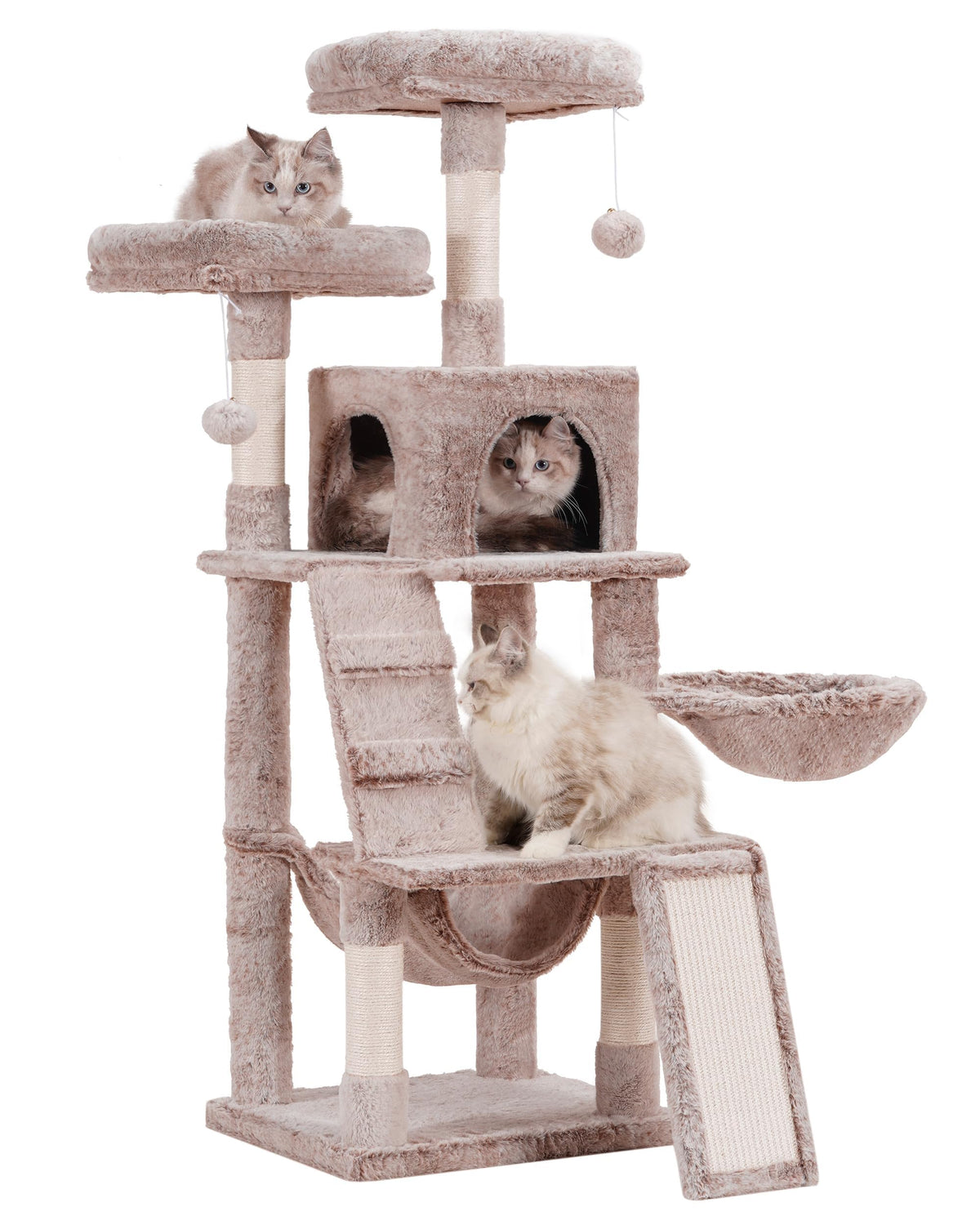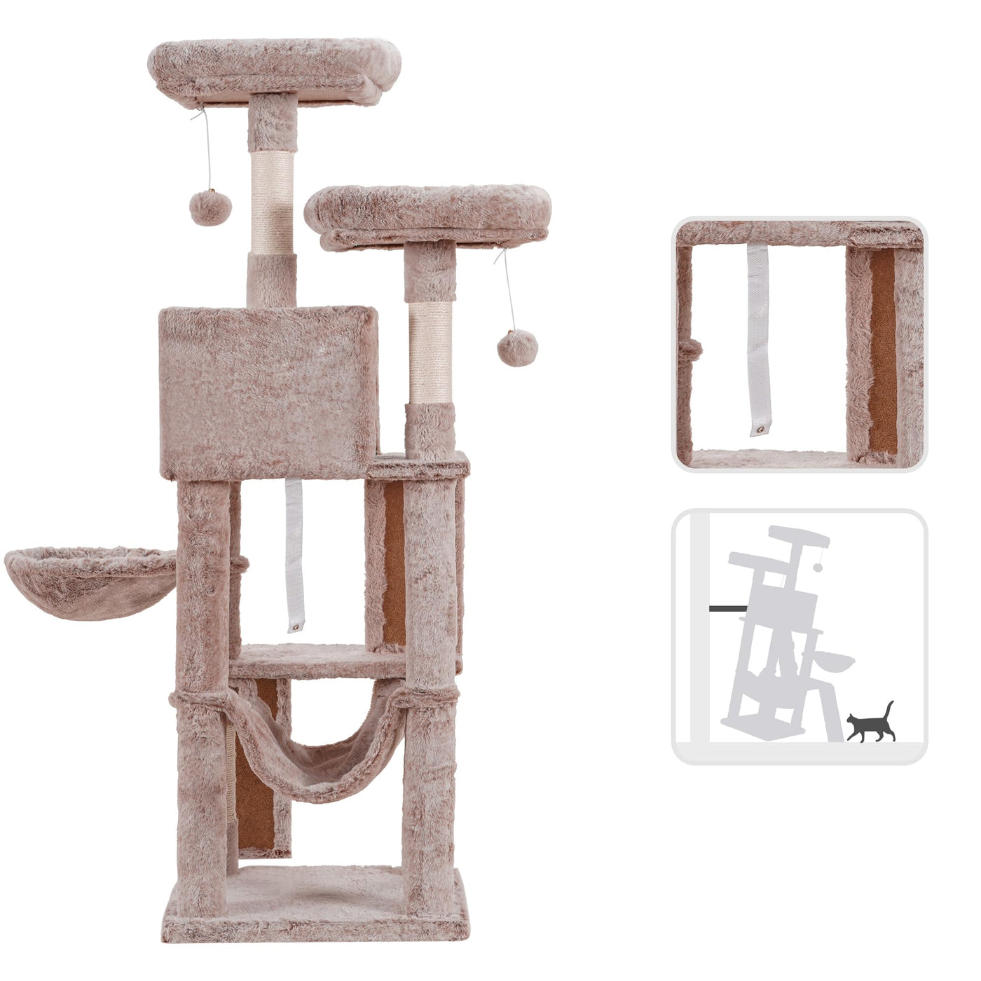 Q: How does the Heybly Cat Tree ensure stability and safety for active cats?A: The Heybly Cat Tree is designed with stability in mind, featuring a reinforced climbing frame base, sisal-wrapped scratching posts, and anti-toppling devices to secure the structure during play.