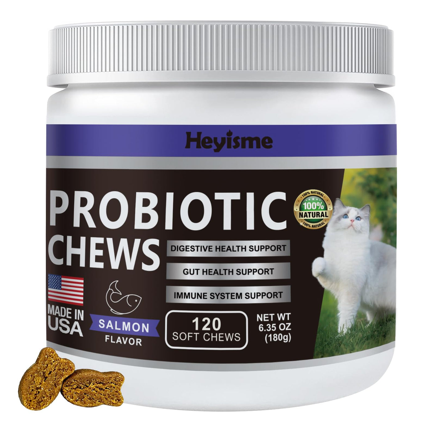 Satisfy your felines cravings while ensuring their optimal health with HEYISMEs cat probiotics Gut and Immune Health supplement. This unique cat supplement features an irresistible texture - crunchy on the outside, creamy on the inside, offering a taste combination that cats adore. Its more than a tasty cat treat; its a proactive step towards enhancing your cats gut and immune health. Our easy-to-administer chews contain functional ingredients that aid your cats gut, digestive health, and immunity. They help to promote regularity and stool quality, offering a more preferable alternative to messy powders. Remember, a healthy cat is a happy cat, and it starts with a balanced gut! Trust in the power of our premium ingredients like probiotics, prebiotics, and omegas. Our cat supplements are packed with probiotics to maintain healthy gut flora and support digestion. The prebiotics foster beneficial bacteria, and the omegas are vital for a robust immune system. All are fused in an alluring salmon flavor that your feline will find irresistible. We, at HEYISME, pledge to deliver a product that your pet will love and trust. Our cat supplements & vitamins are formulated with the finest natural ingredients and devoid of corn, wheat, soy, artificial preservatives, colors, or flavors. We take pride in manufacturing our products in the USA, with locally and globally sourced ingredients. Our production follows GMP-compliant standards, ensuring youre giving your pet the best quality product. Give your cat the gift of health and happiness with HEYISMEs cat probiotic Gut + Immune Health supplement!