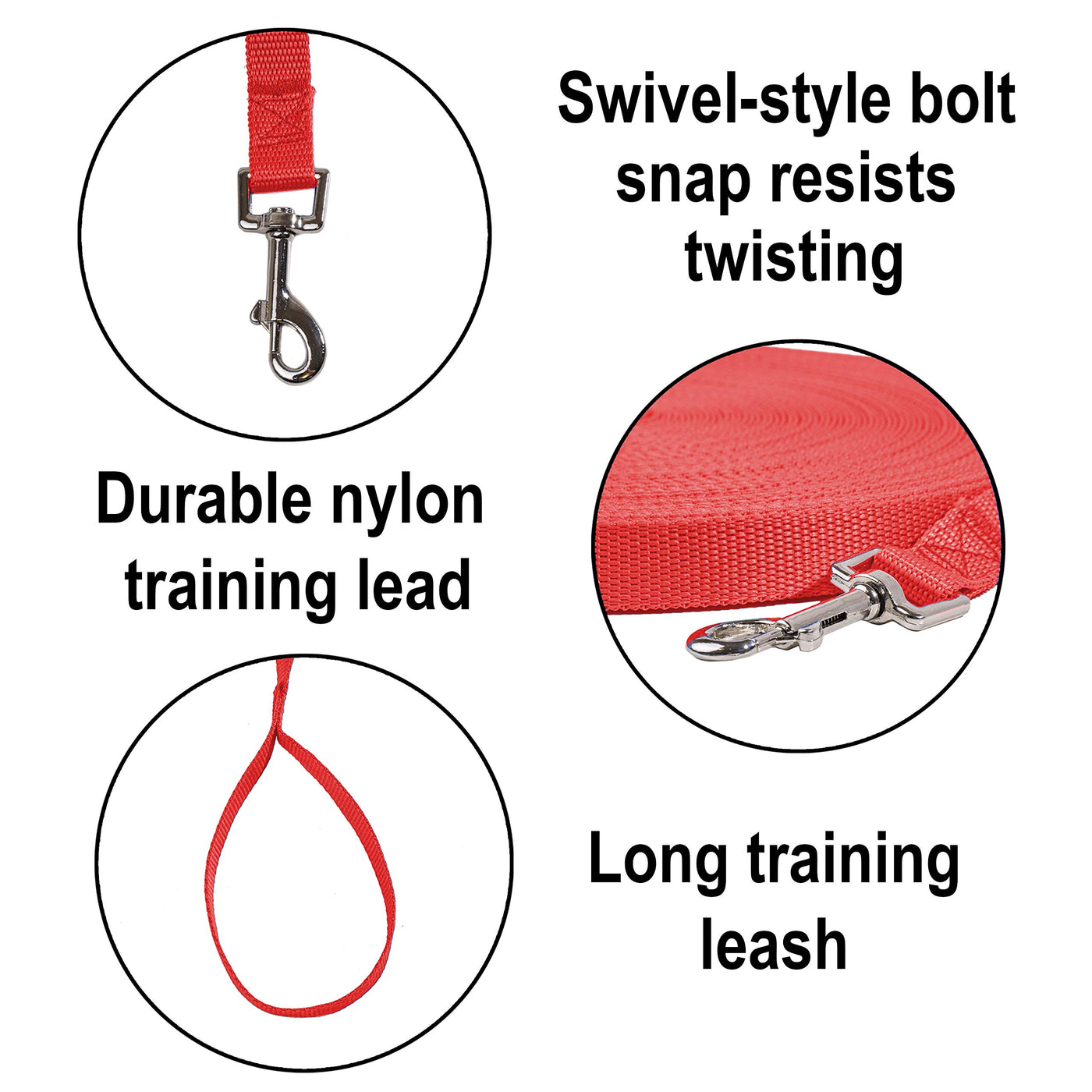 This durable, long, nylon dog training leash will outlast cotton leashes. All stitching is reinforced and the nickel plated clip swivels to resist twisting. Our long dog leash is great for medium and large dogs. You'll love using it as a backyard dog leash, for off leash dog training, and more.Hi Kiss nylon training leash provide extra strength for controlling large dogs. This extra long training lead is designed for distance training. Handle the dogs with this sturdy leads. This nylon training leash heavy duty 100-percent nylon lead is strong enough to control even large dogs. Swivel-style bolt snap resists twisting. This lead is guaranteed for life. Measures 3/4in wide by 15ft 20ft 30ft 50ft 100ft length.