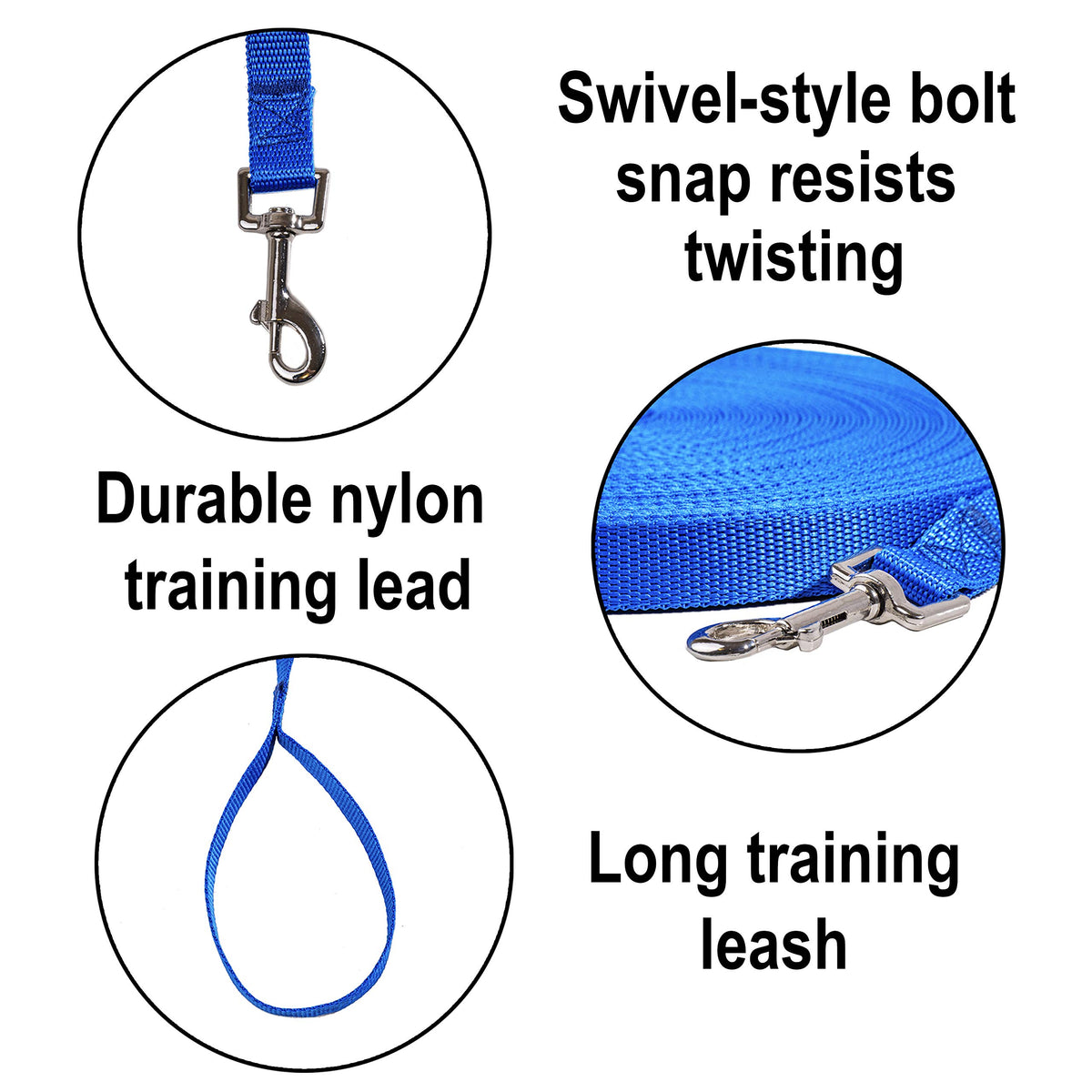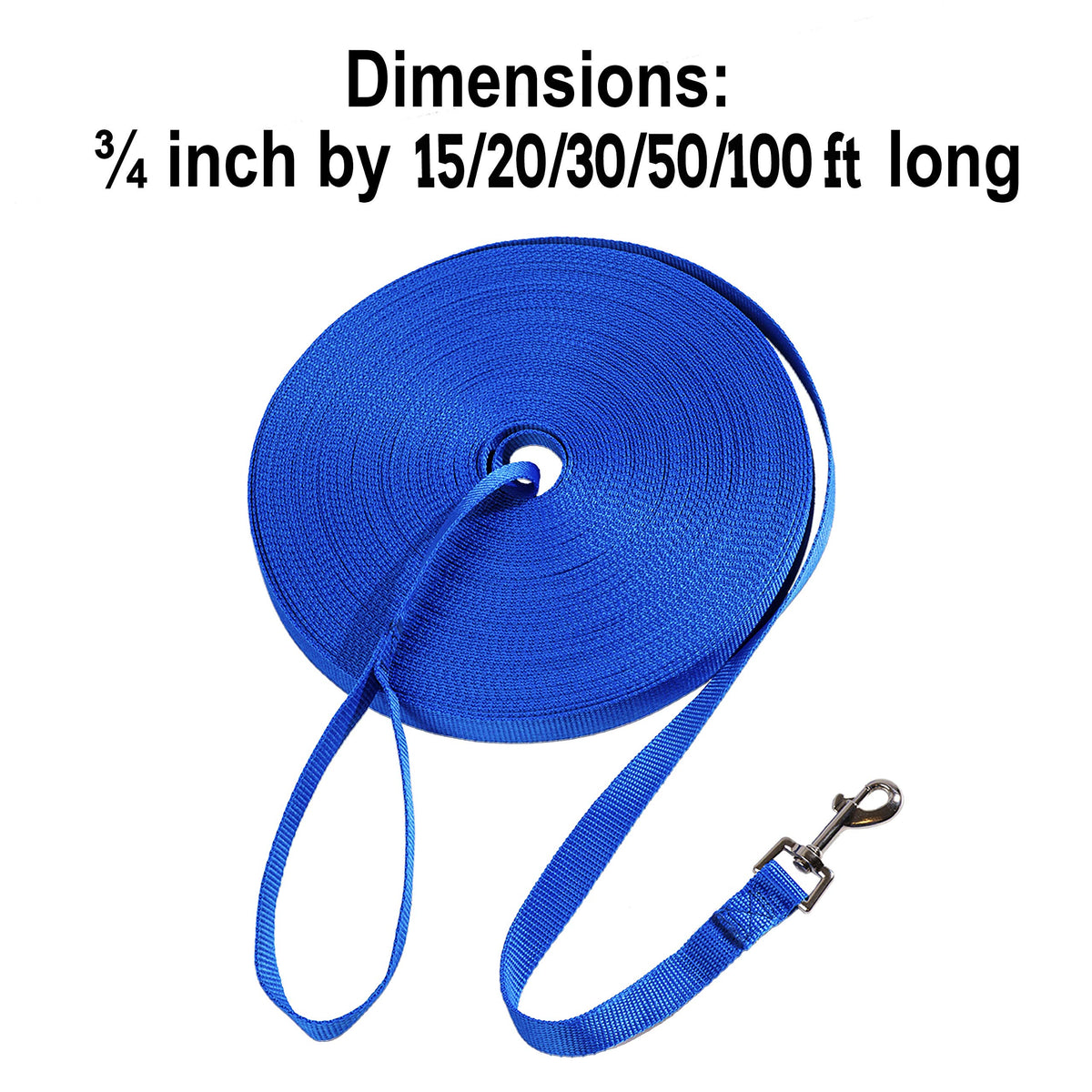 This durable, long, nylon dog training leash will outlast cotton leashes. All stitching is reinforced and the nickel plated clip swivels to resist twisting. Our long dog leash is great for medium and large dogs. You'll love using it as a backyard dog leash, for off leash dog training, and more.Hi Kiss nylon training leash provide extra strength for controlling large dogs. This extra long training lead is designed for distance training. Handle the dogs with this sturdy leads. This nylon training leash heavy duty 100-percent nylon lead is strong enough to control even large dogs. Swivel-style bolt snap resists twisting. This lead is guaranteed for life. Measures 3/4in wide by 15ft 20ft 30ft 50ft 100ft length.