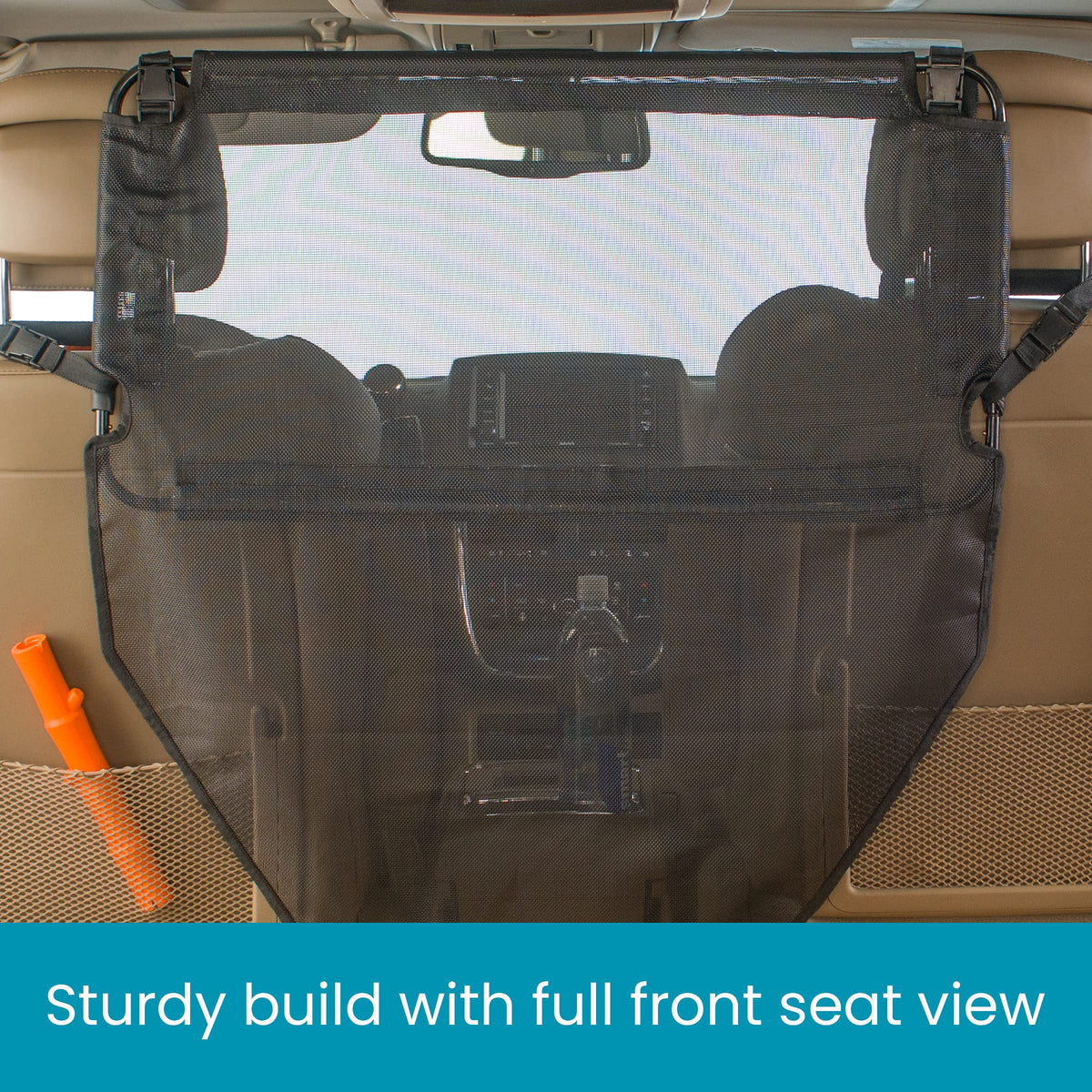 The perfect dog and pet travel accessory, the High Road Car Dog Barrier secures dogs in the backseat for safer drives. A driving necessity for road trips and touring with your four legged best friend passenger. Attaches securely to front seat headrests and car seat rails. A dog car divider back seat barrier with a padded steel frame and heavy duty mesh net barrier construction. A dog net for car and net to keep dogs in back seat