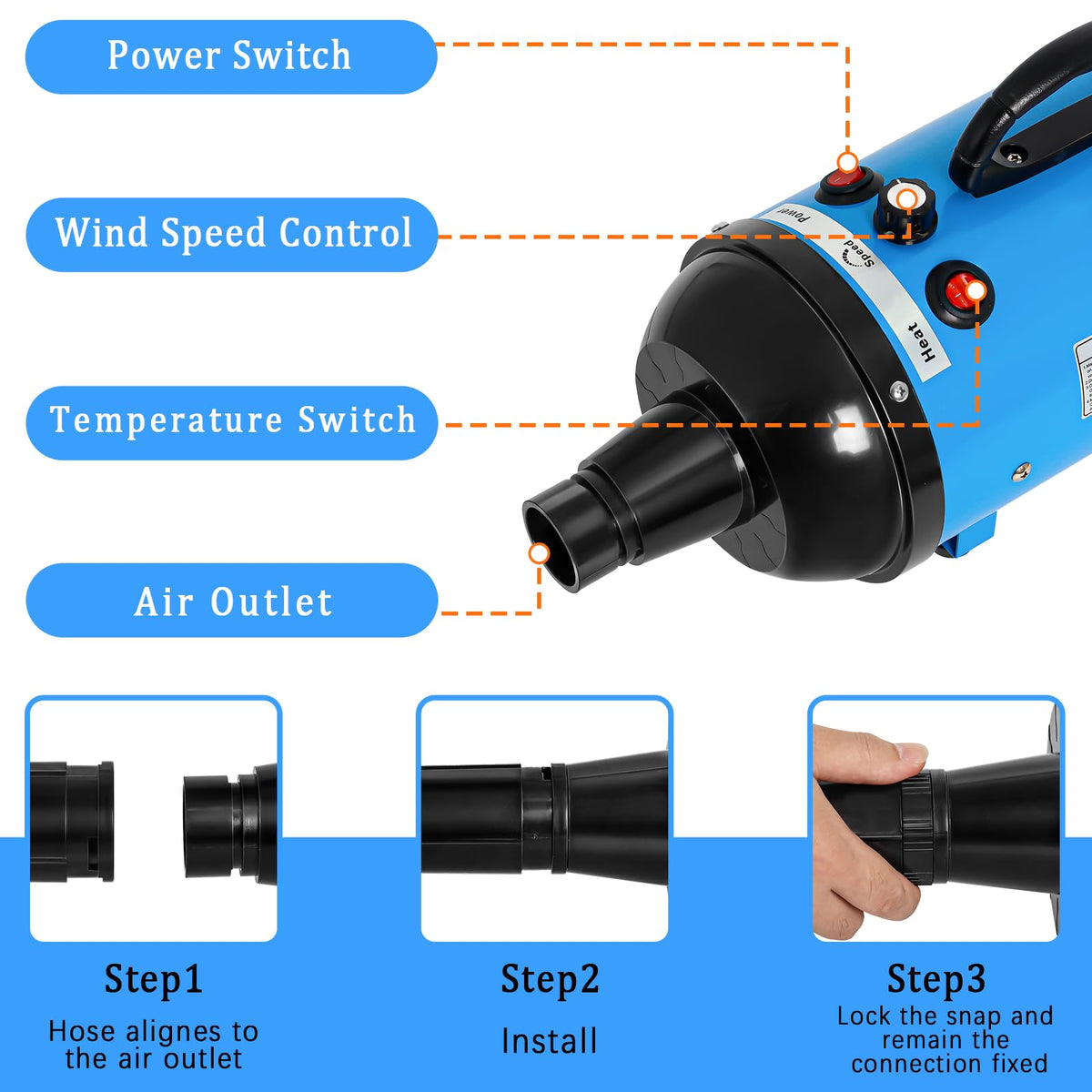 High Velocity 5.2Hp 3500W Large Dog Hair Dryer With Heater For Grooming - Adjustable Temperature With 4 Nozzles (Blue)