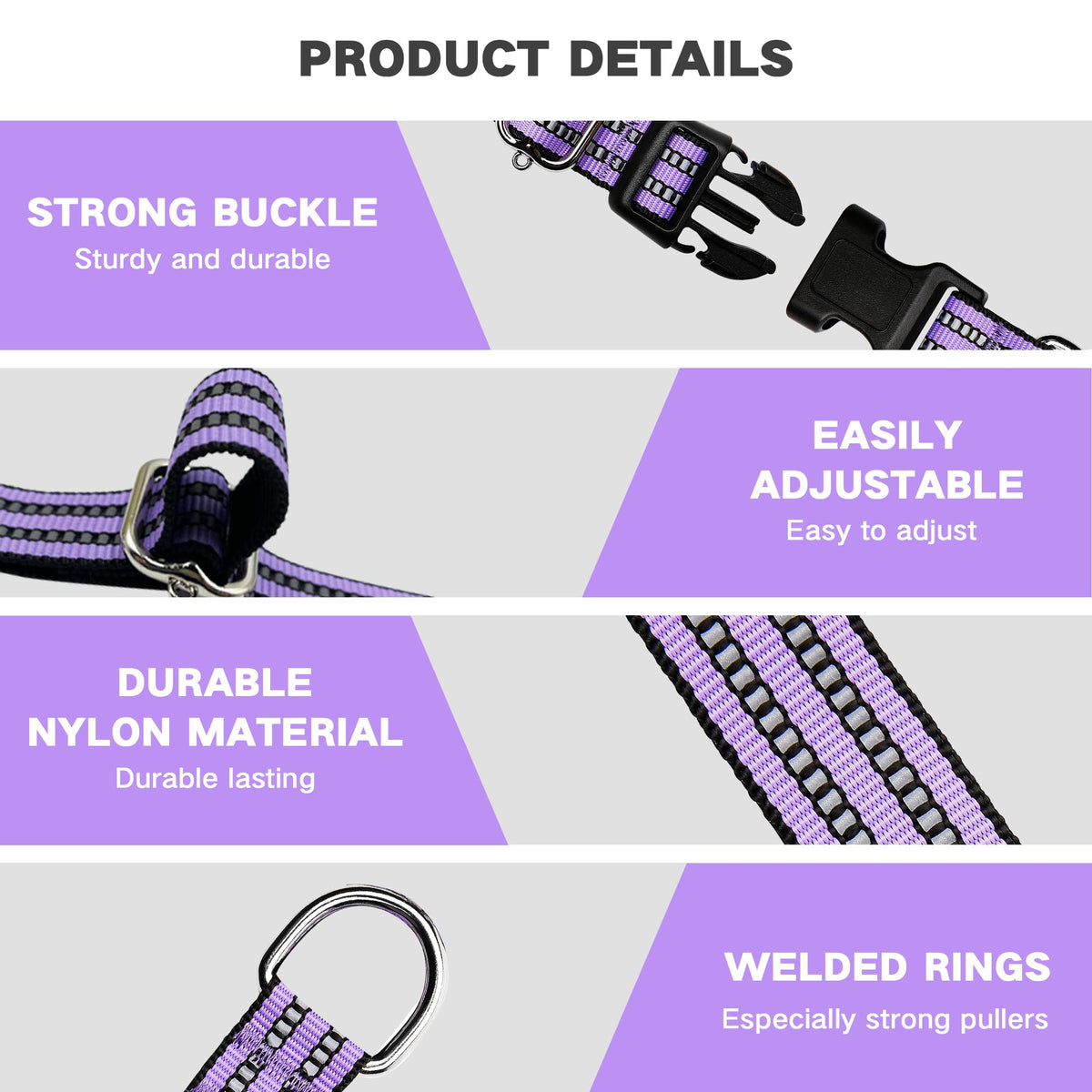 *The dog collars are made of high-density nylon webbing, heavy-duty stainless steel, and strong plastic buckle. Strict pulling test conducted before production.