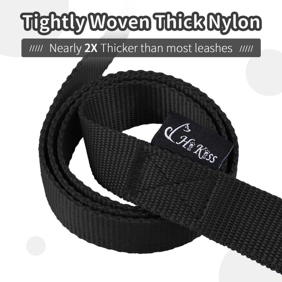 Q: What materials is the HIKISS Long Dog Leash made from?A: The HIKISS Long Dog Leash is made from heavy-duty nylon webbing, specifically designed to be nearly 2X thicker than most leashes, ensuring durability and strength for training and outdoor activities.