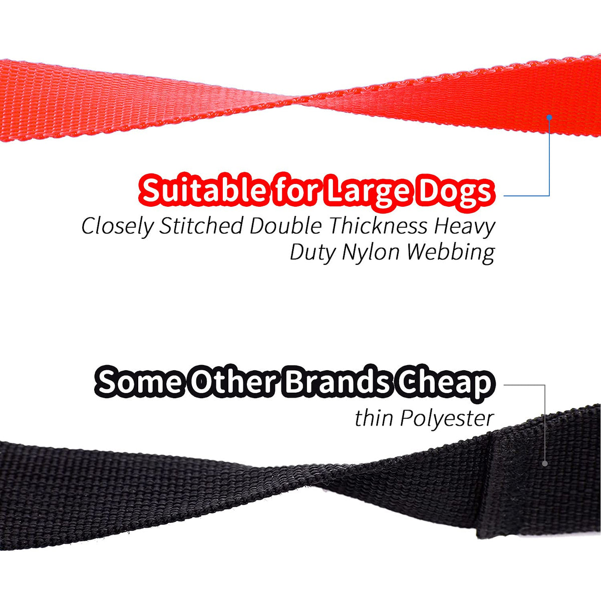 HEAVY DUTY - This training dog leash made with closely stitched double thickness heavy duty nylon webbing Nearly 2X Thicker than most leashes STRENgTHEN cLASP - Heavy duty rust resistant copper alloy clip suitable for mediumlarge breedsEasy on and easy off hook DIMENSIONS - This dog leash measures 1 inch wide by 15ft long great for hiking camping training hunting backyard beach recall training outdoor play with tennis balls and swimming LONg LEASH - This training leash is great for teaching your dog recalls It has the length needed to allow them to wander and ensure your command to come 100% MONEYBAcK gUARANTEE - No matter you and your dog not like this dog leash no problem get your money back or send you a new one