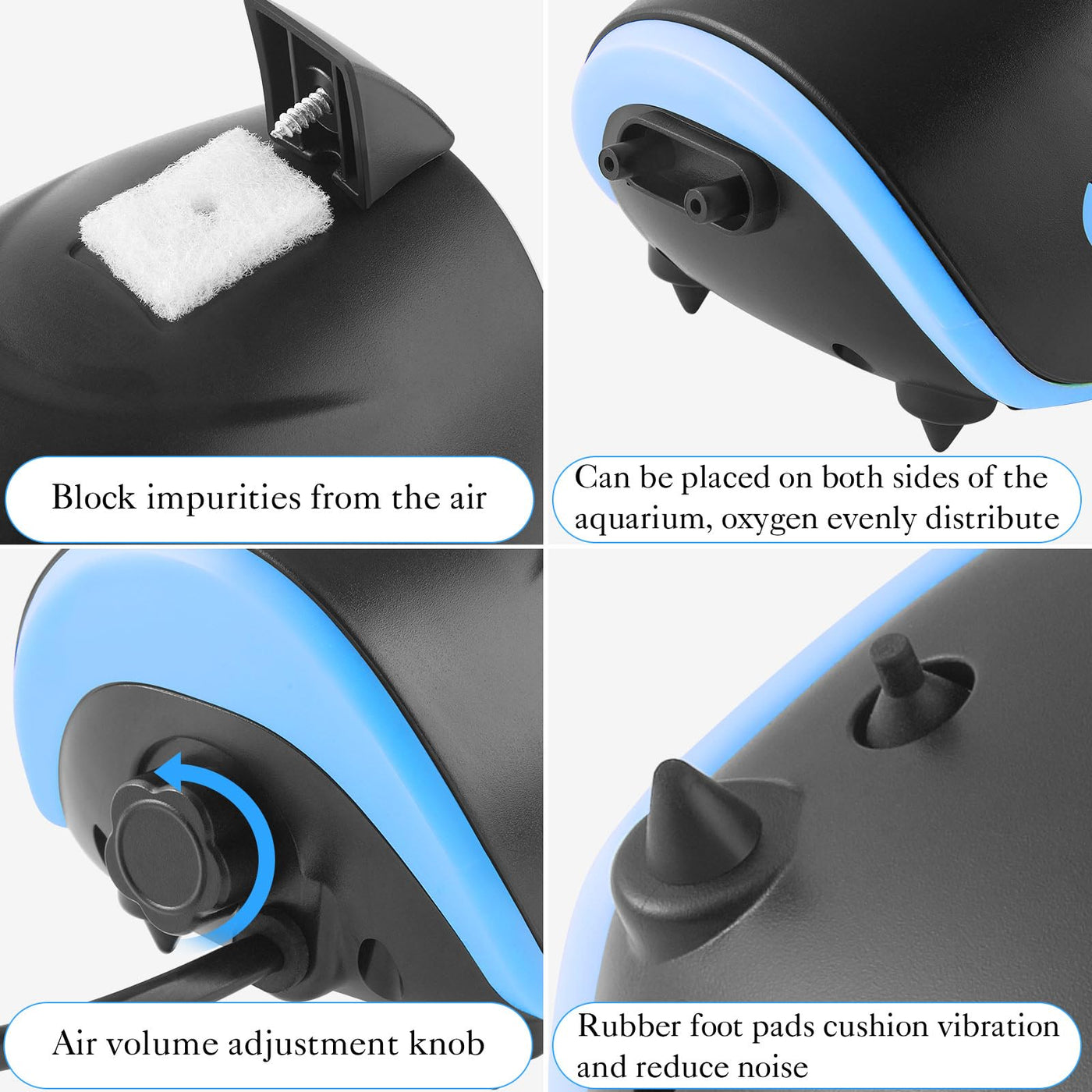 HITOP 3W Quiet Aquarium Air Pump: 80GPH Adjustable Fish Tank Air Pump with Dual Output, Powerful Shark-Shaped Aquarium Aerator,