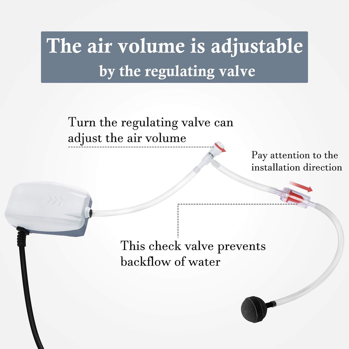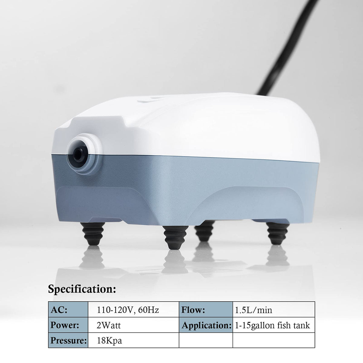 Specification AC: 110-120V, 60Hz Power: 2Watt Pressure: 18Kpa Flow: 1.5L/min Package including: Single outlet aquarium air pump x 1 Air tube(4.9ft) x 1 Air stone x 1 Check valve x 1(Can be used when the air pump is placed below the surface of the fish tank) Regulating valve x 1(installed on the air tube to adjust the air volume) Note:There is no adjusting knob on the air pump, but we presented a regulating valve, which can be installed on the air tube to adjust the air volume.