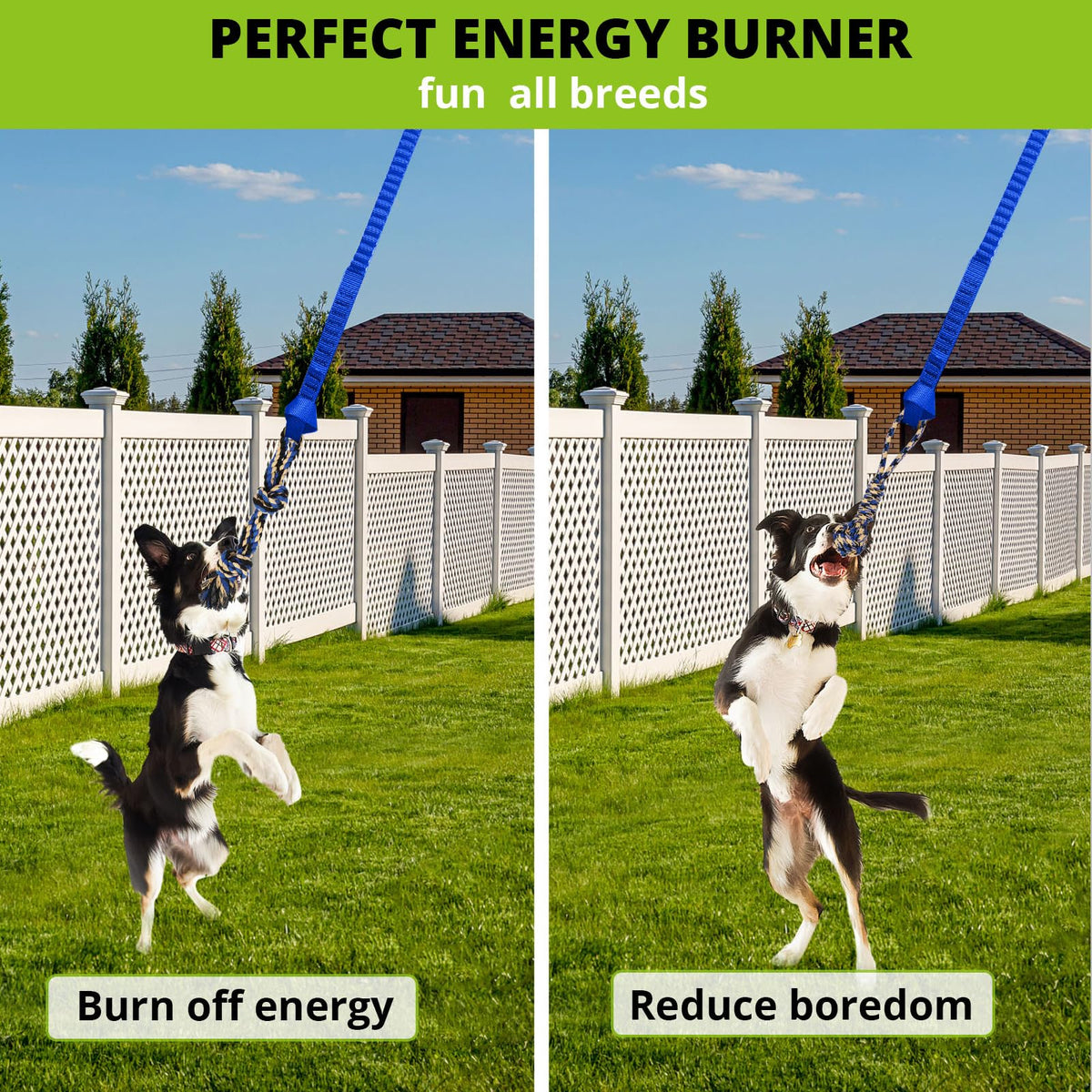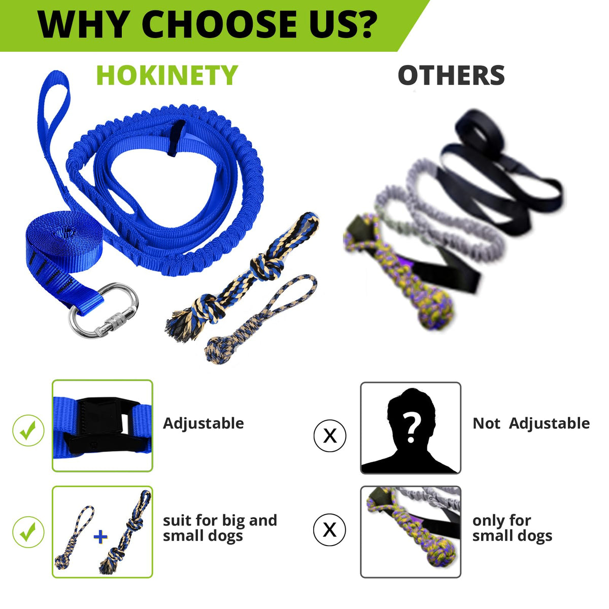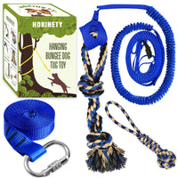 Are you looking for a new high-quality rope dog toys suitable for both indoor & outdoor games with dog? HOKINETY Interactive Bungee Dog Tug Toy is a fun new outdoor dog tug toy that hangs. It is a hanging dog rope toy that uses bungee to create a force for your dog to tug against. It pulls back, it bounces, and it shoots away for them to chase down and play again. It will never get lost or end up super dirty in the mud as it hangs in one place safe from lawn mowers! We have designed two different sizes of cotton chew rope toys for big dogs and medium/small dogs. You can also easily replace a worn attachment toy without replacing the entire toy. This toy perfectly simulates tug-o-war game and entices your dog to pull, hang and swing. You can hang our dog rope bungee toy from a tree branch or wood beam under your deck, or wrap it around a tree. Instructions For Use: Part 1 serves to fasten the system to the tree. It 's 94 inch long * 5cm wide and can be installed on a tree with up to 27inch in diameter. Part 2 is used for throwing over the tree branch, with length of 130 inch, the bungee deisgn can be pull to 147 inch. It includes a buckle that allows you to customize the height of a toy suspension. Part 3 is a small dog rope toy for pet aggressive chewers, its not a chew toy! What 's more,you can use the Carabiner to connect the part 1 and part 2. Part 4 is a big Indestructible Knot Rope Tug, you can use big dog bite tug toy instead of small ones for big dogs. Package Including: 2 X Dog cotton rope toys 1 X Bungee cord (11ft) 1 X Sturdy outdoor safety rope(8ft) 1 X Bag